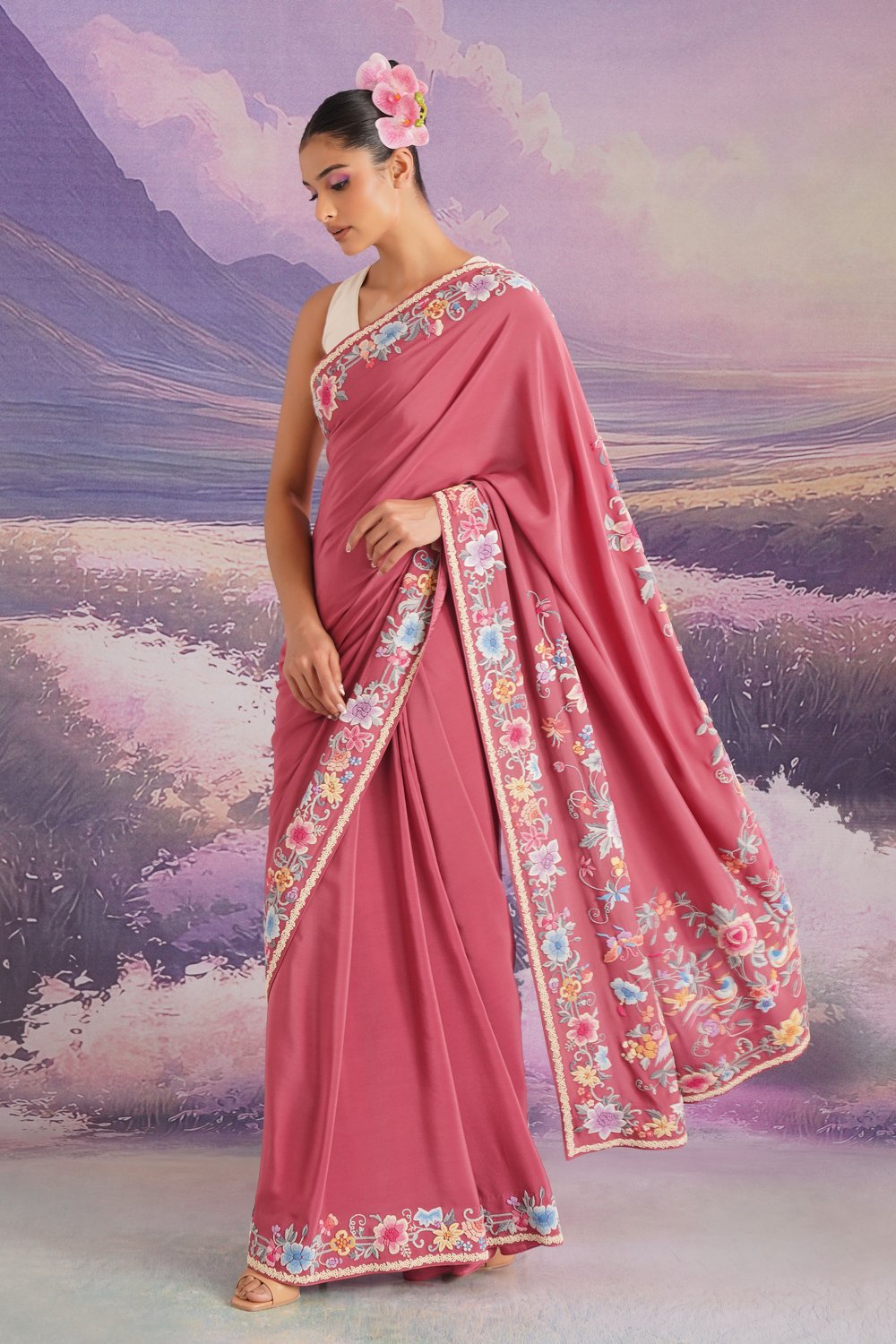 We’ve used the time consuming, highly-skilled craft to lend a beautiful three-dimensional effect to our florals. With carefully curated colour combinations and materials, these saris have been designed to feel timeless yet special each time you wear it.