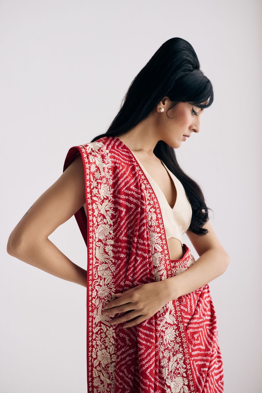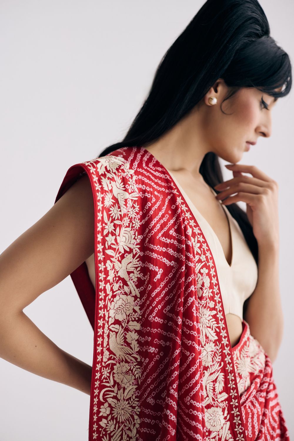 The Asha sari features delicate bandhani dots arranged in leheriya-style geometric lines and a parsi gara border with flowers & birds.