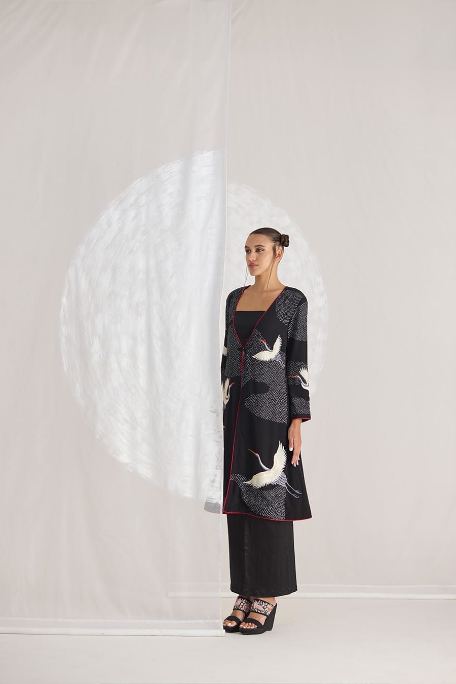 Say hello to our ‘Crane’ jacket in classic ebony. The longline cut and soft fabric make it perfectly suited for day and night. Hand embroidered cranes are in flight over organic patterns formed by bandhani dots.
