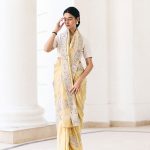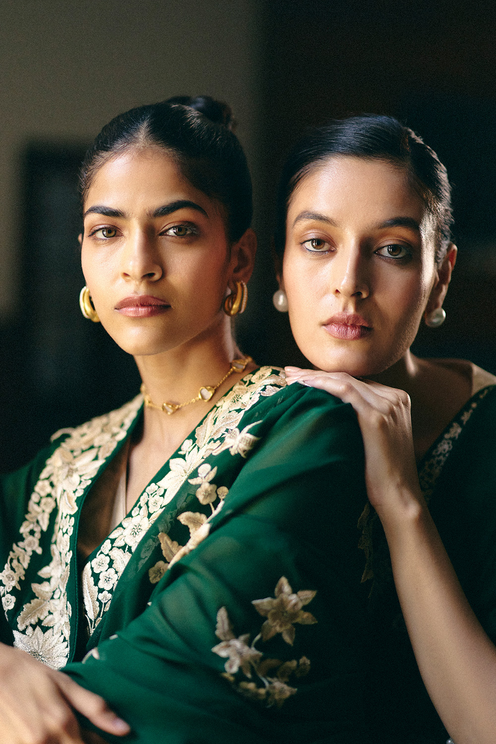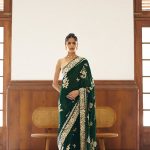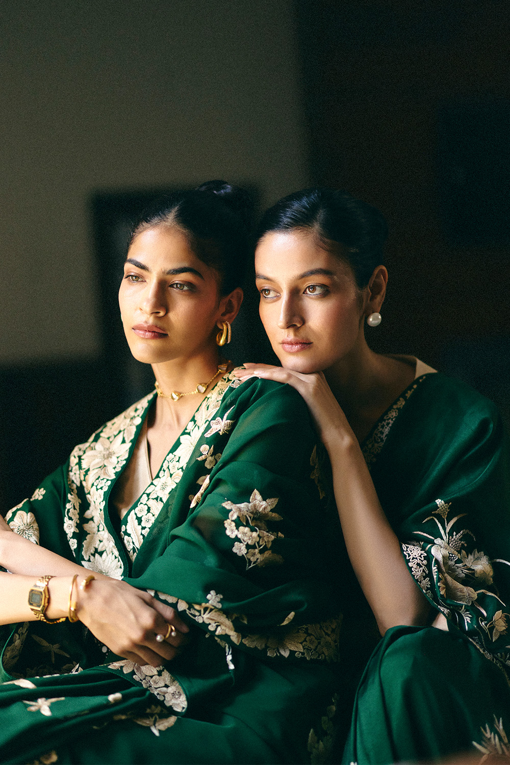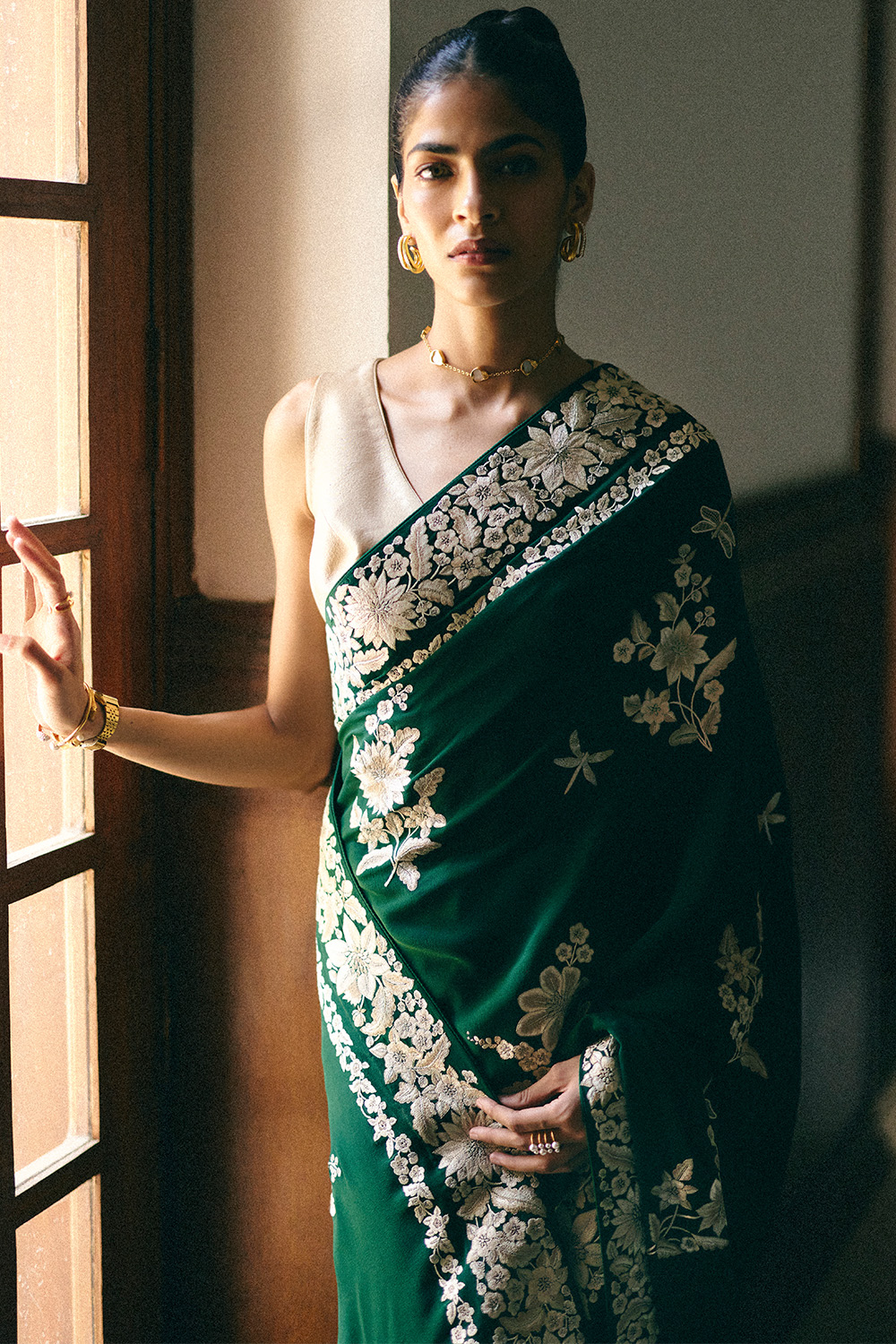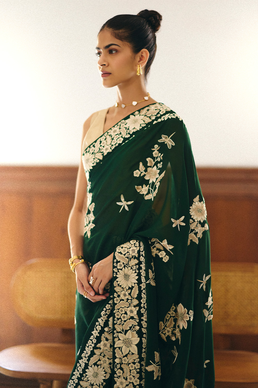Our Damselfly sari in Fern Green georgette from our latest ‘Wildflowers’ collection features damselflies and blooms framed by a rich floral border. All hand-embroidered at our atelier in glorious shades of off white, cream, beige, silver & gold.