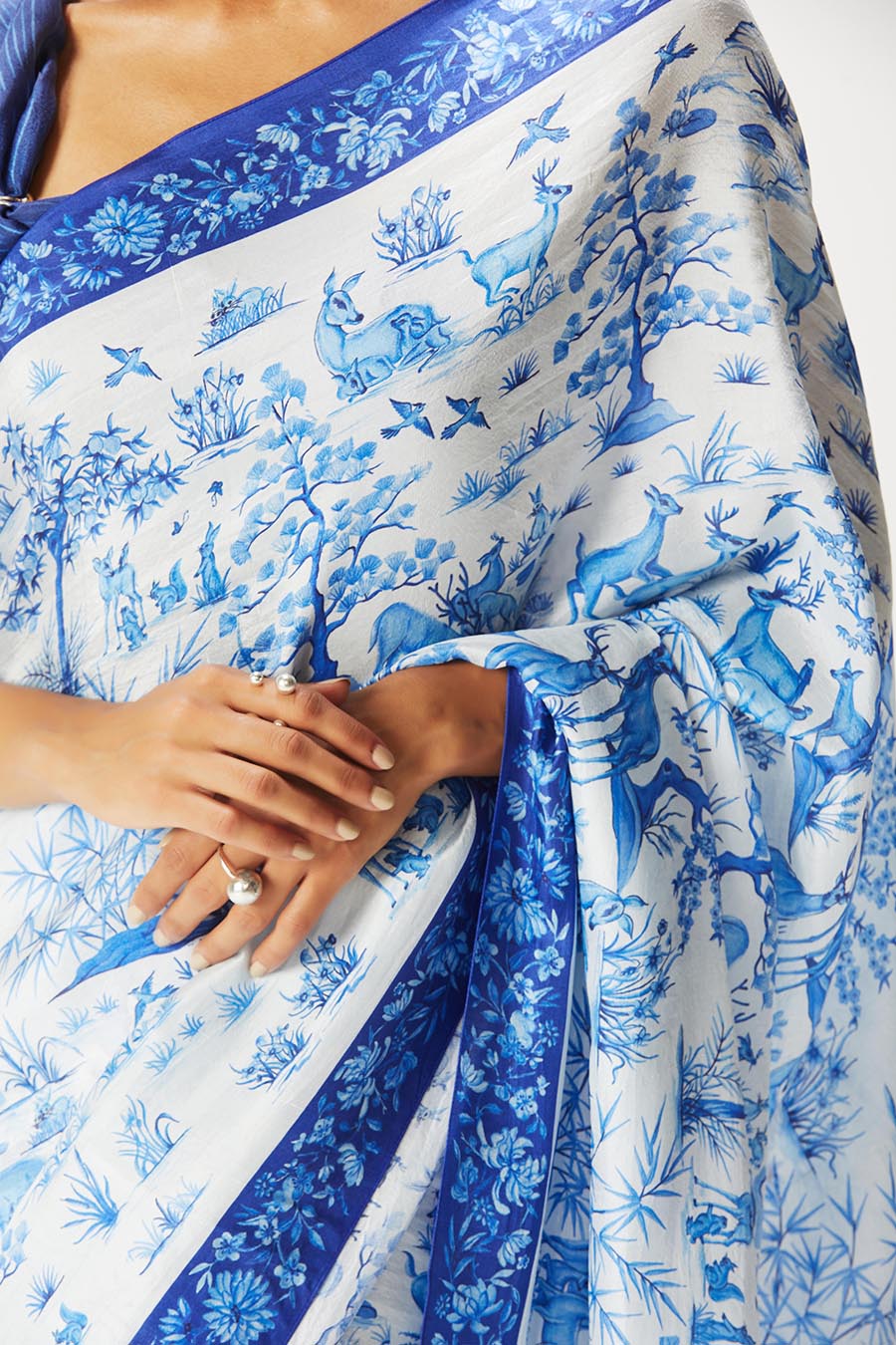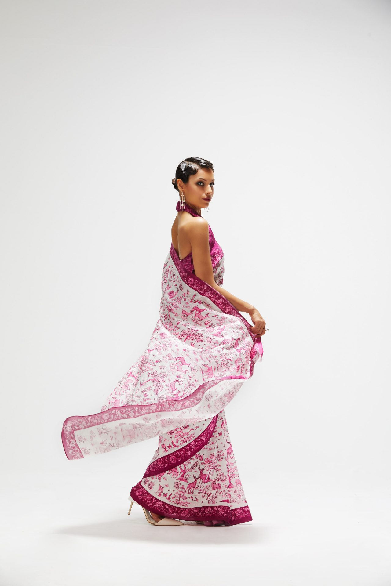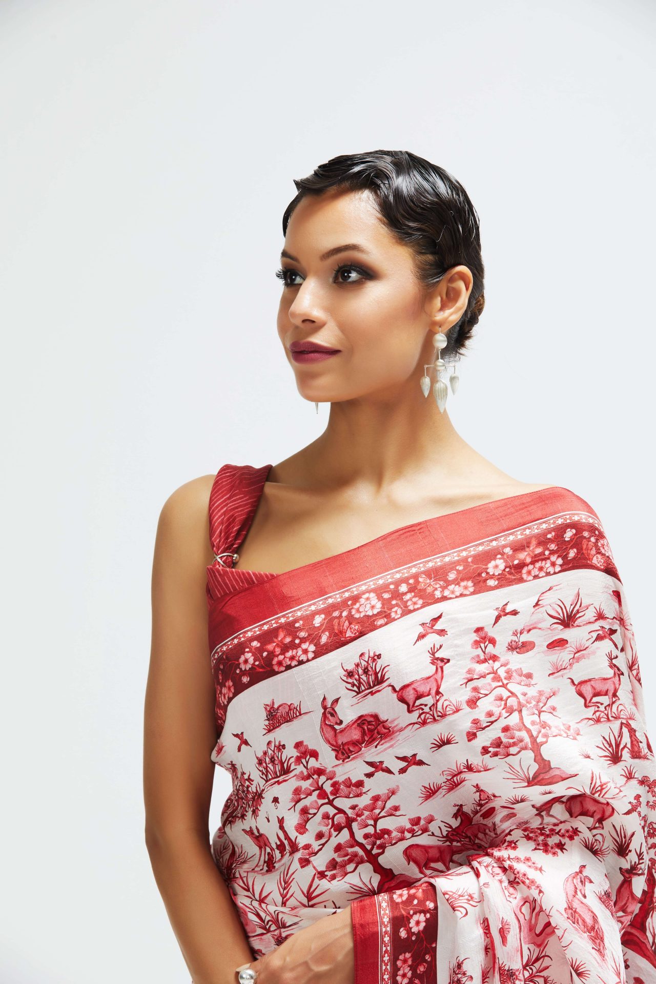 Ballerina Ritika Chandra’s expansive movements meet the fantastical ‘Eden’ sari in a classic white and red colour way from Rhythm & Blues- our Summer 2022 print collection