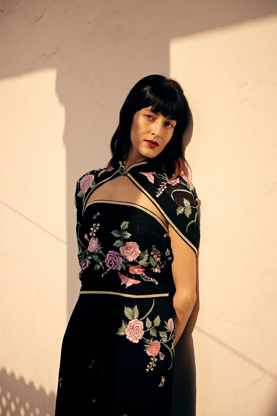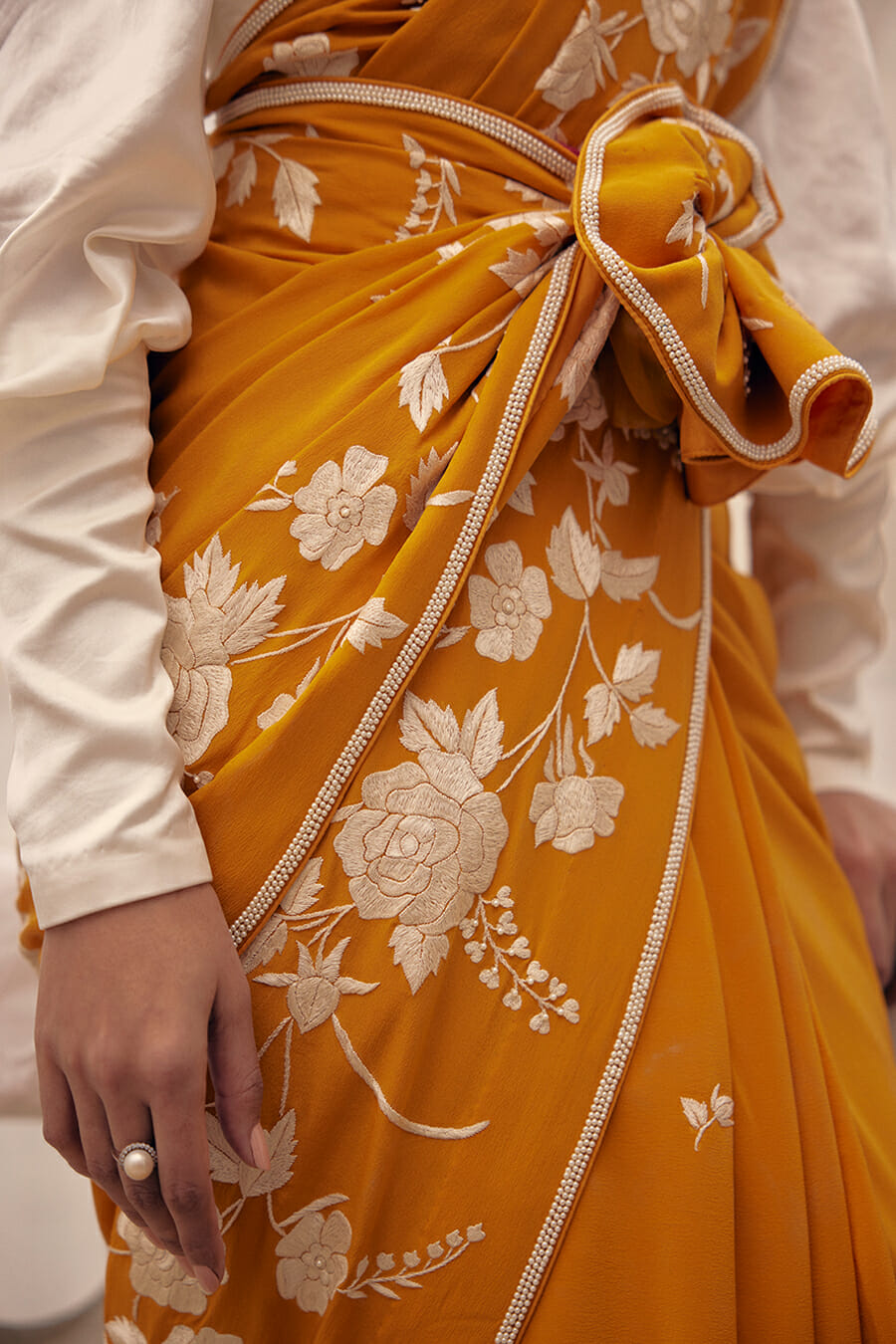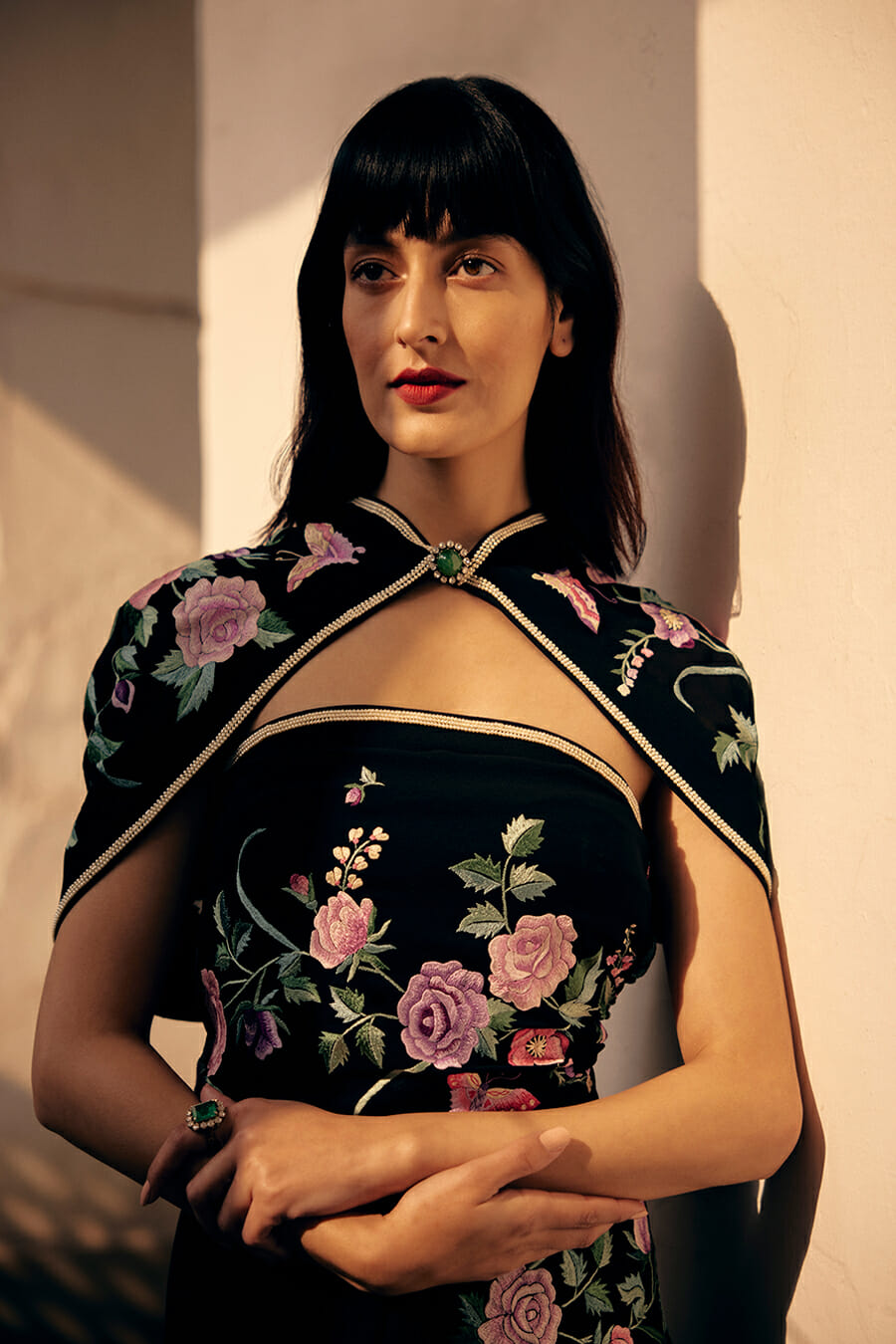 If there’s one sari that encapsulates the spirit of our spring 2023 collection, it’s got to be the Evening Rose sari handcrafted in black crepe.