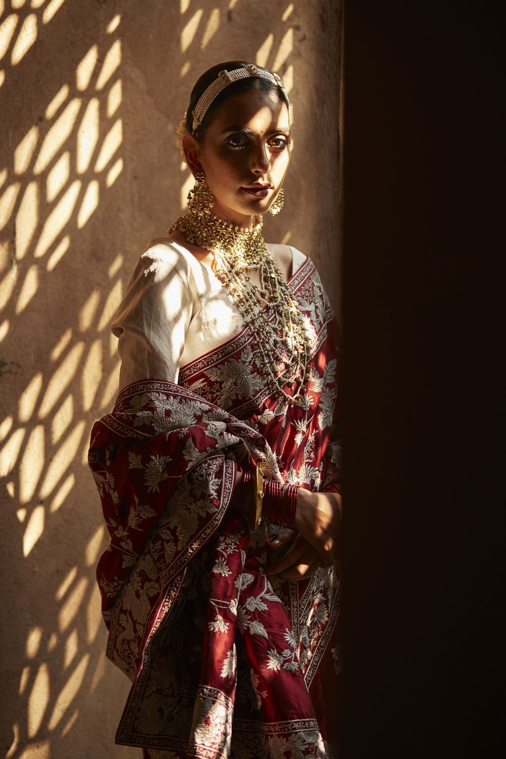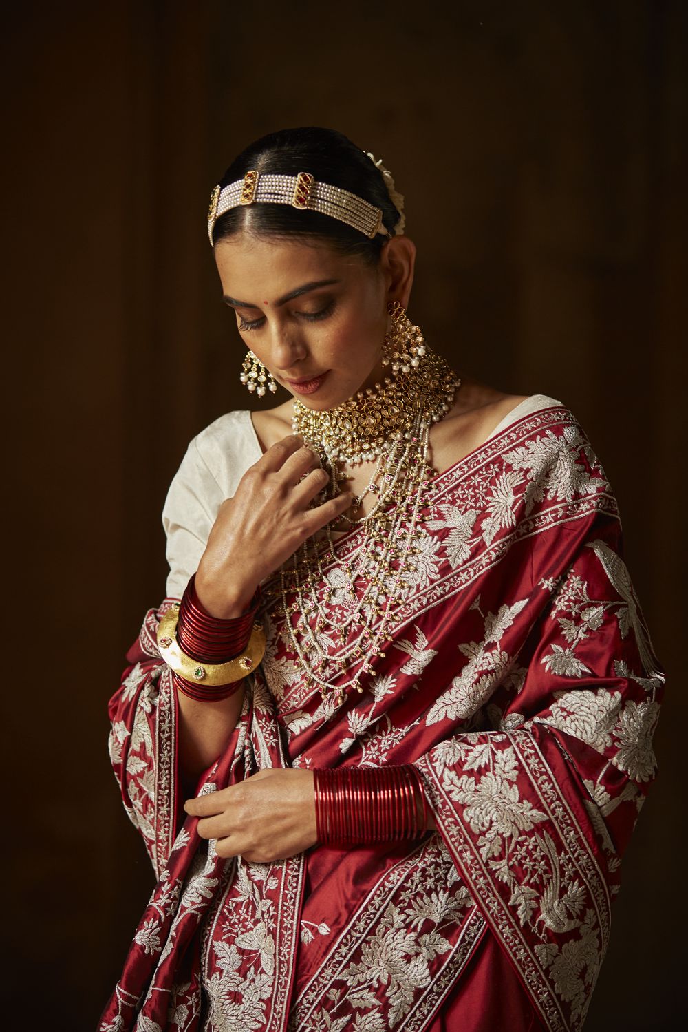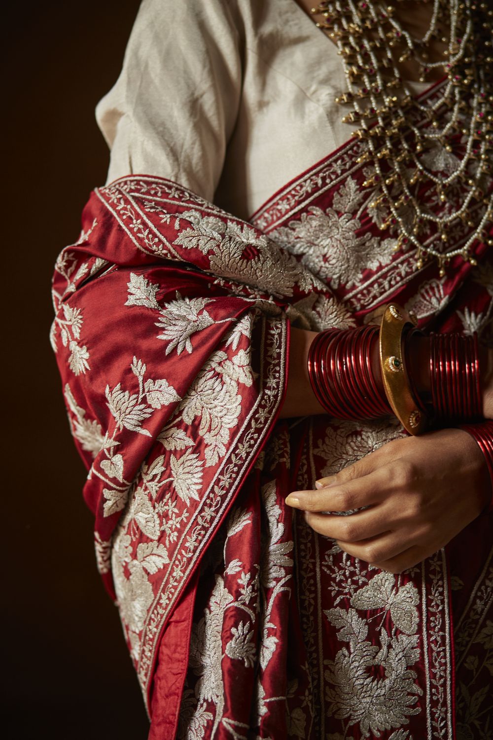 Here’s your favourite Kiku Jaal sari reimagined in a sumptuous लाल or red, perfect for today’s multicultural bride.