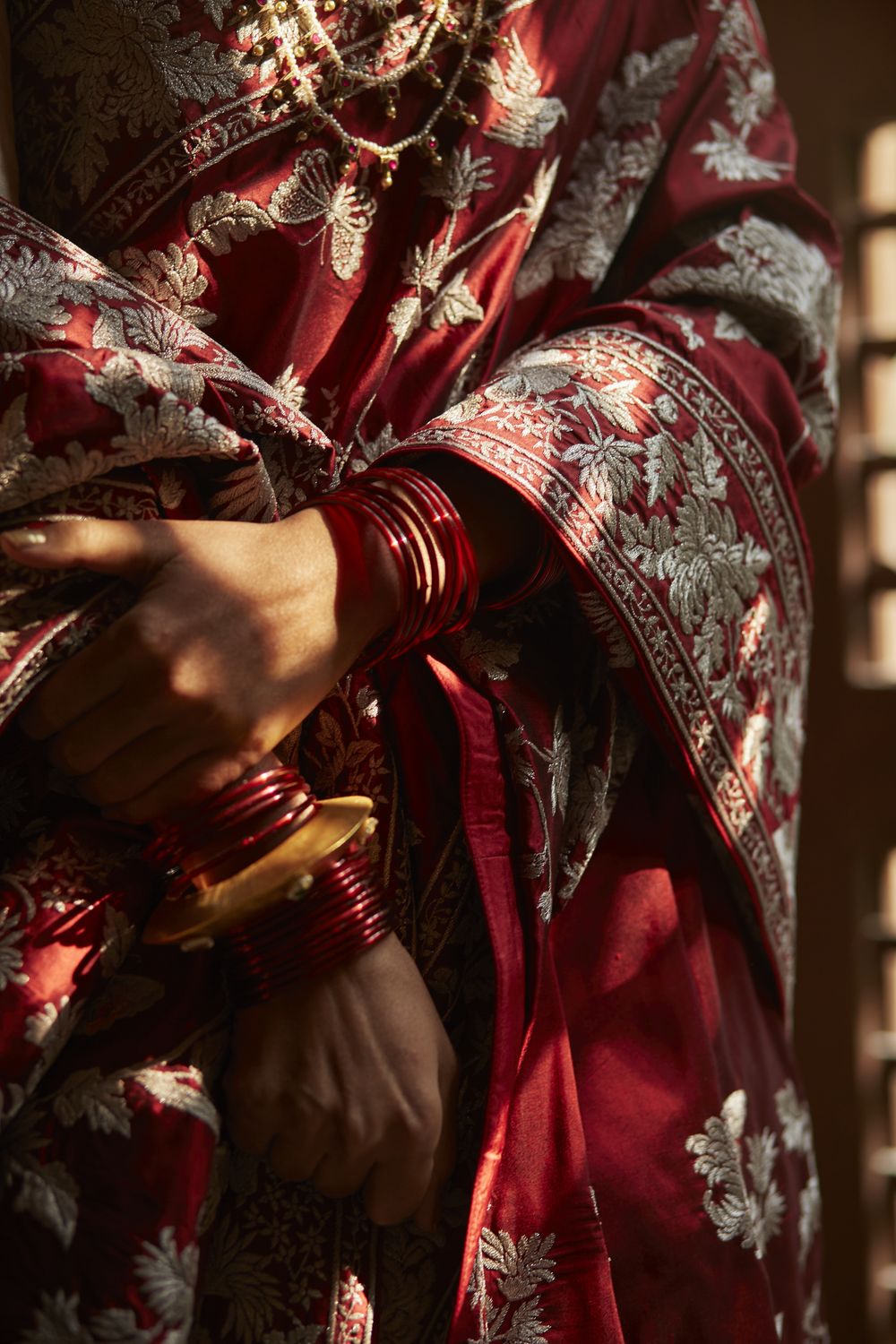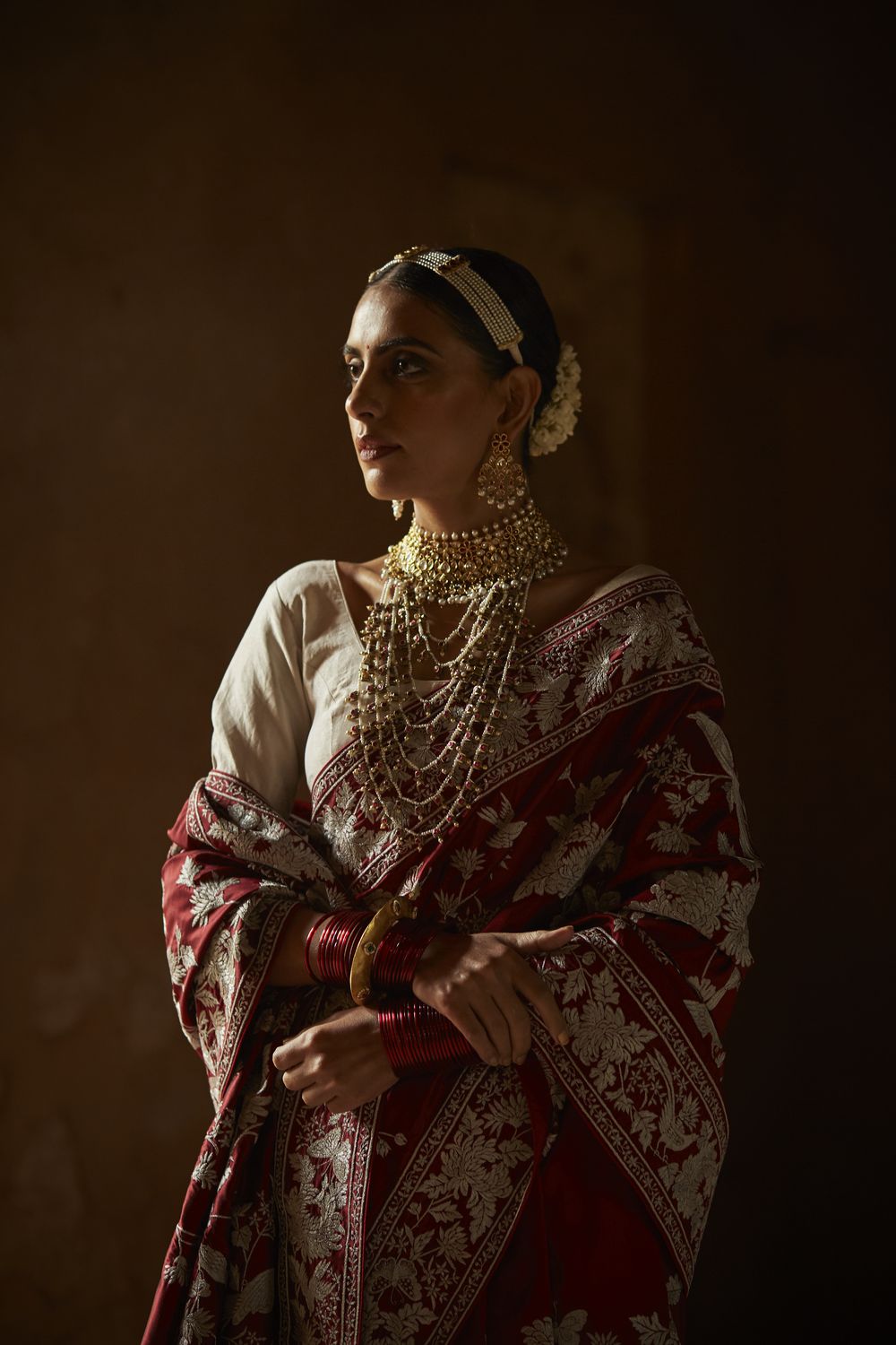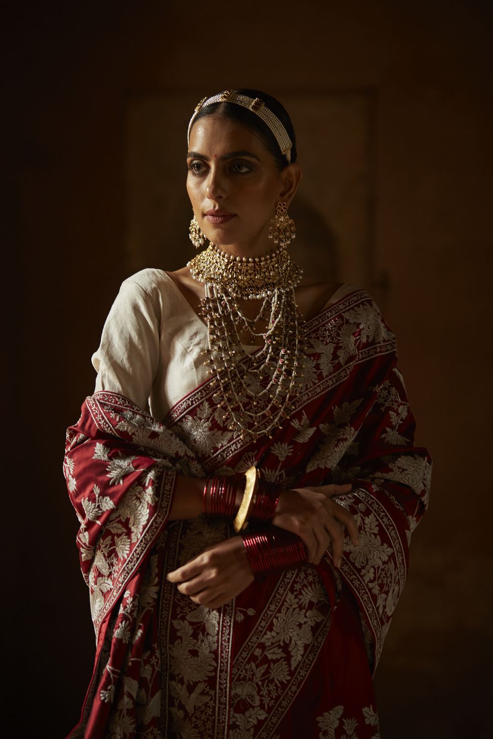 Here’s your favourite Kiku Jaal sari reimagined in a sumptuous लाल or red, perfect for today’s multicultural bride.