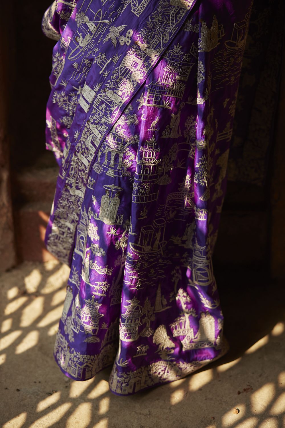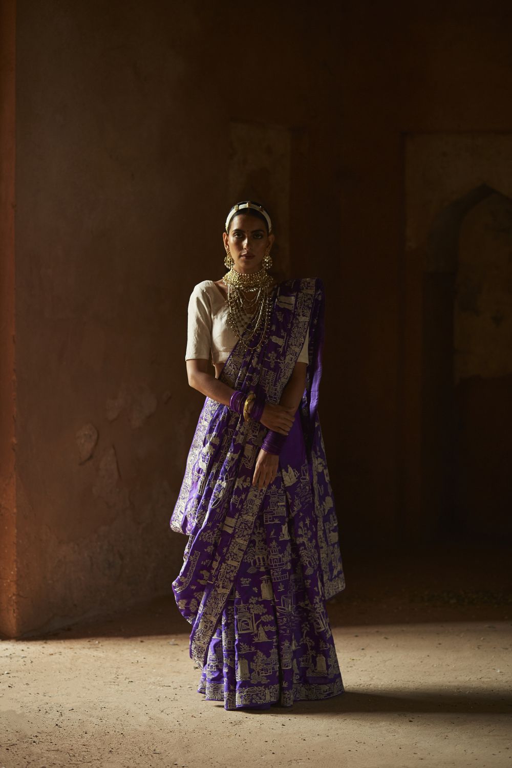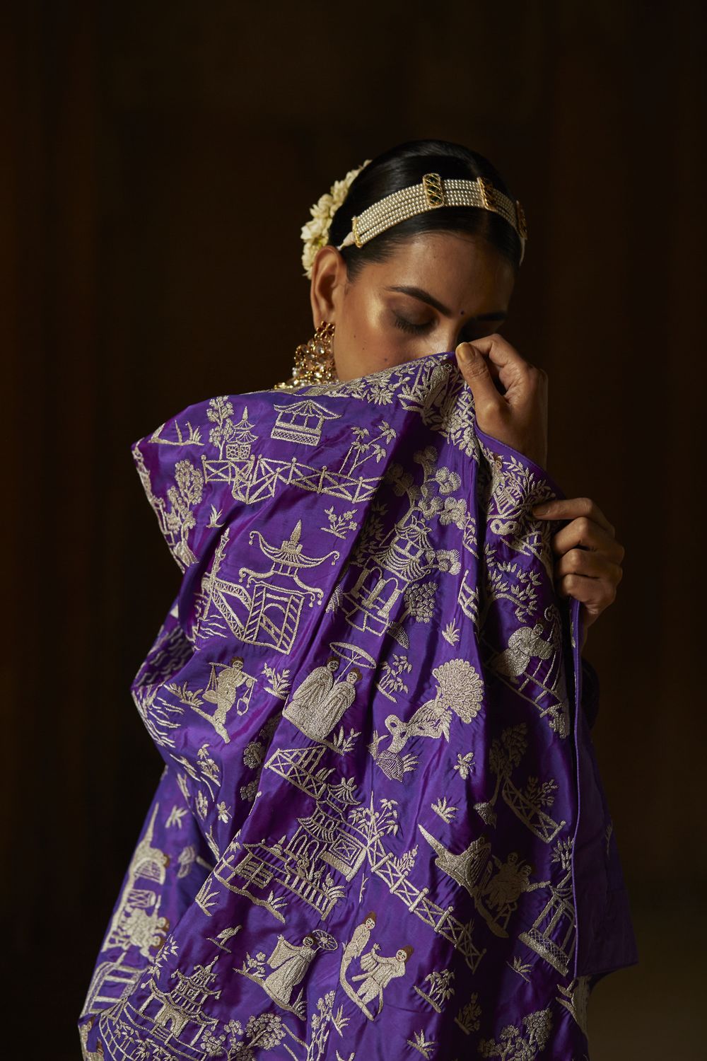 Meet our all-time-favourite Cheena Cheeni sari with the most astonishingly intricate embroidery story, in a new avatar, this time in royal purple or जामुनी रंग.