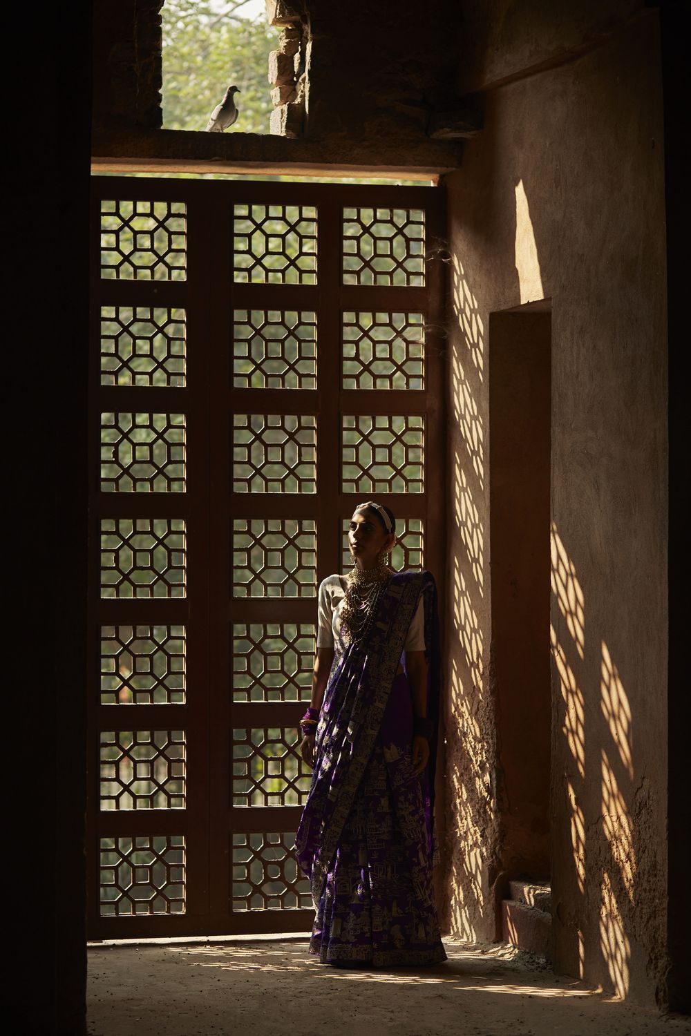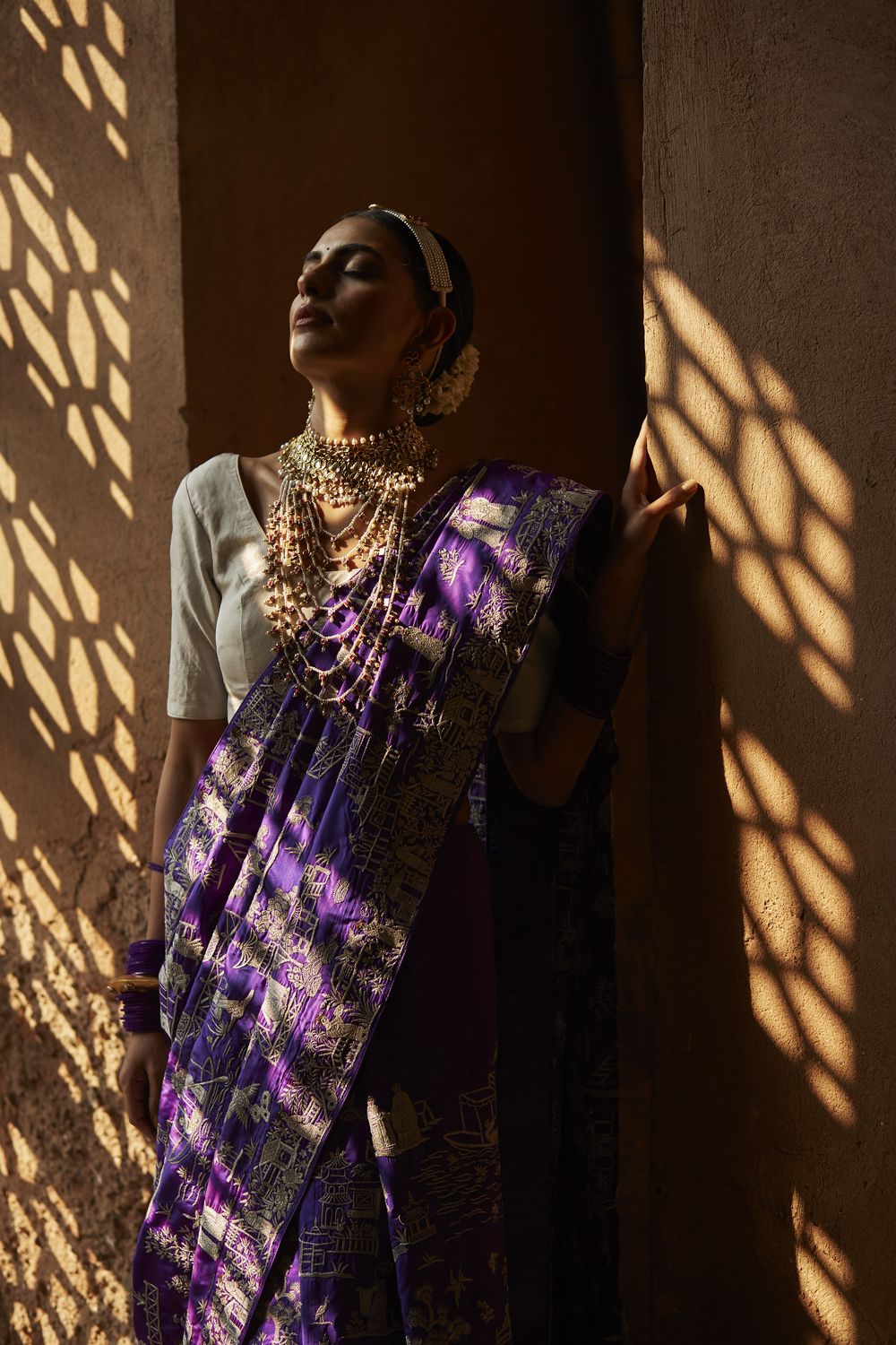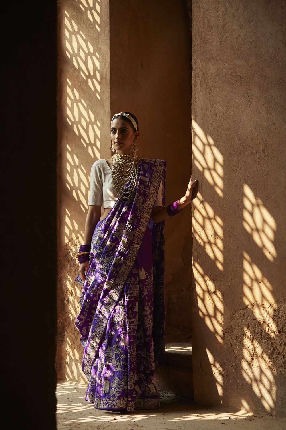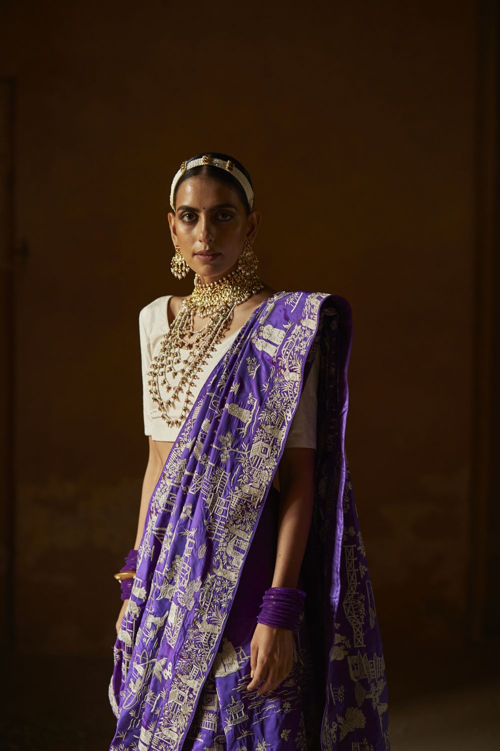 Meet our all-time-favourite Cheena Cheeni sari with the most astonishingly intricate embroidery story, in a new avatar, this time in royal purple or जामुनी रंग.