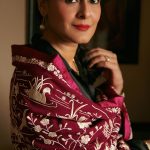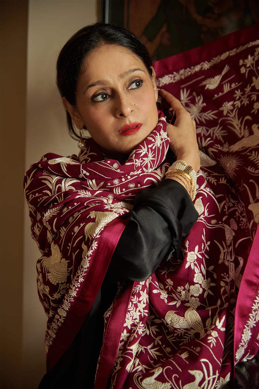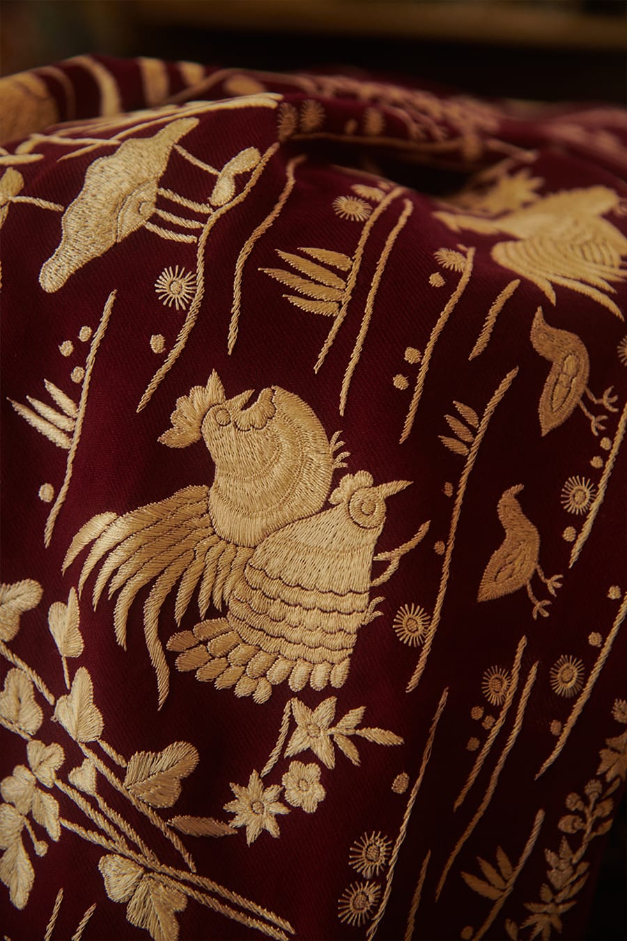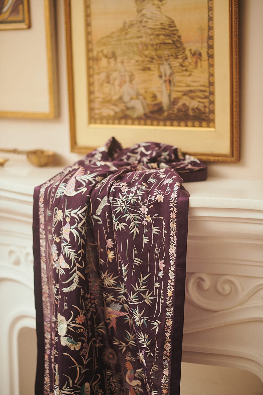 A closer look at our hand-embroidered Morning Glory pashmina shawl featuring a dreamscape of cranes, river reeds and water lilies, bamboo and other flora. A rich ode to the beautiful winter months.