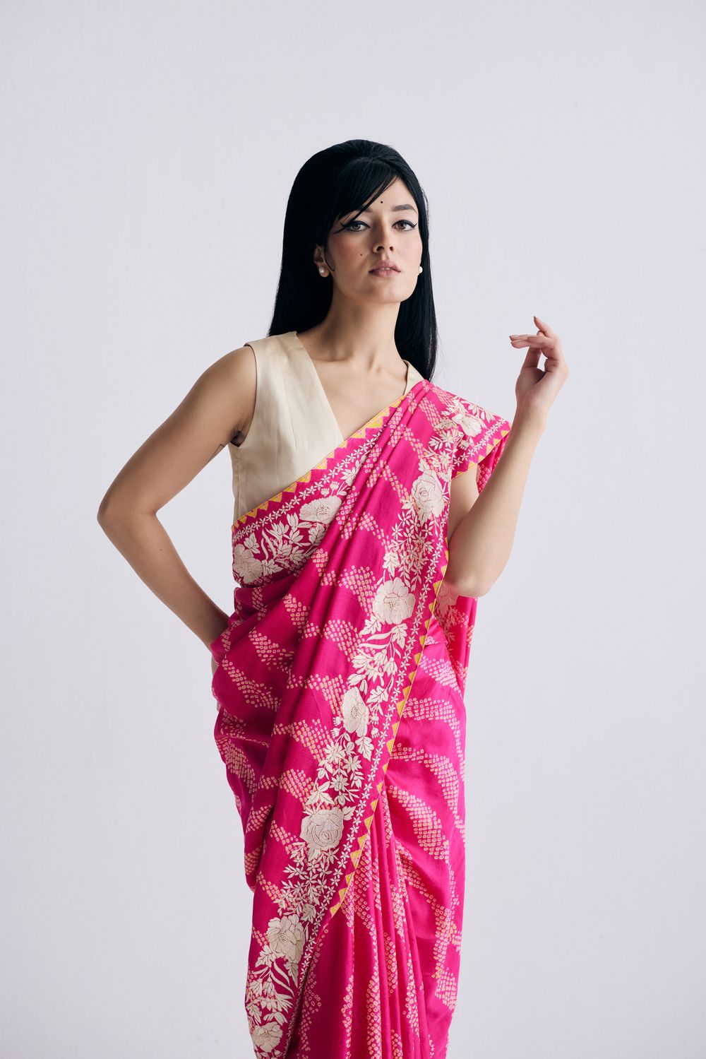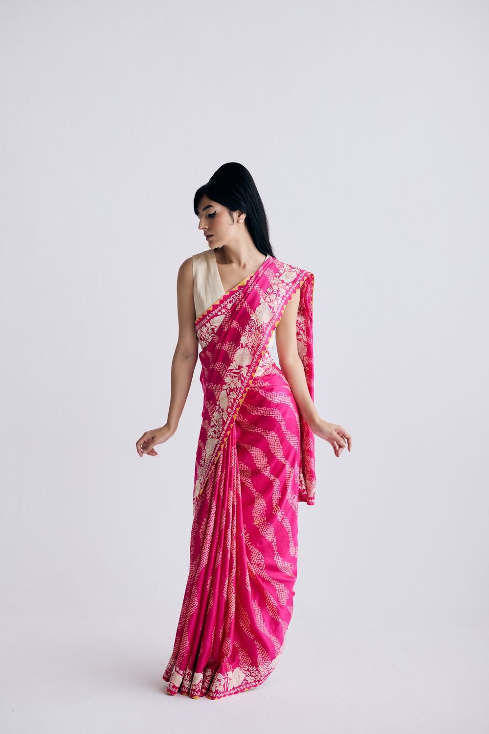 This Barbie knows how to look dressed up and chilled out at the same time in our Mumtaz sari from the Bombay Talkies collection. Bandhani waves meet sweet Parsi Gara florals like they’ve known each other forever. Utterly charming!