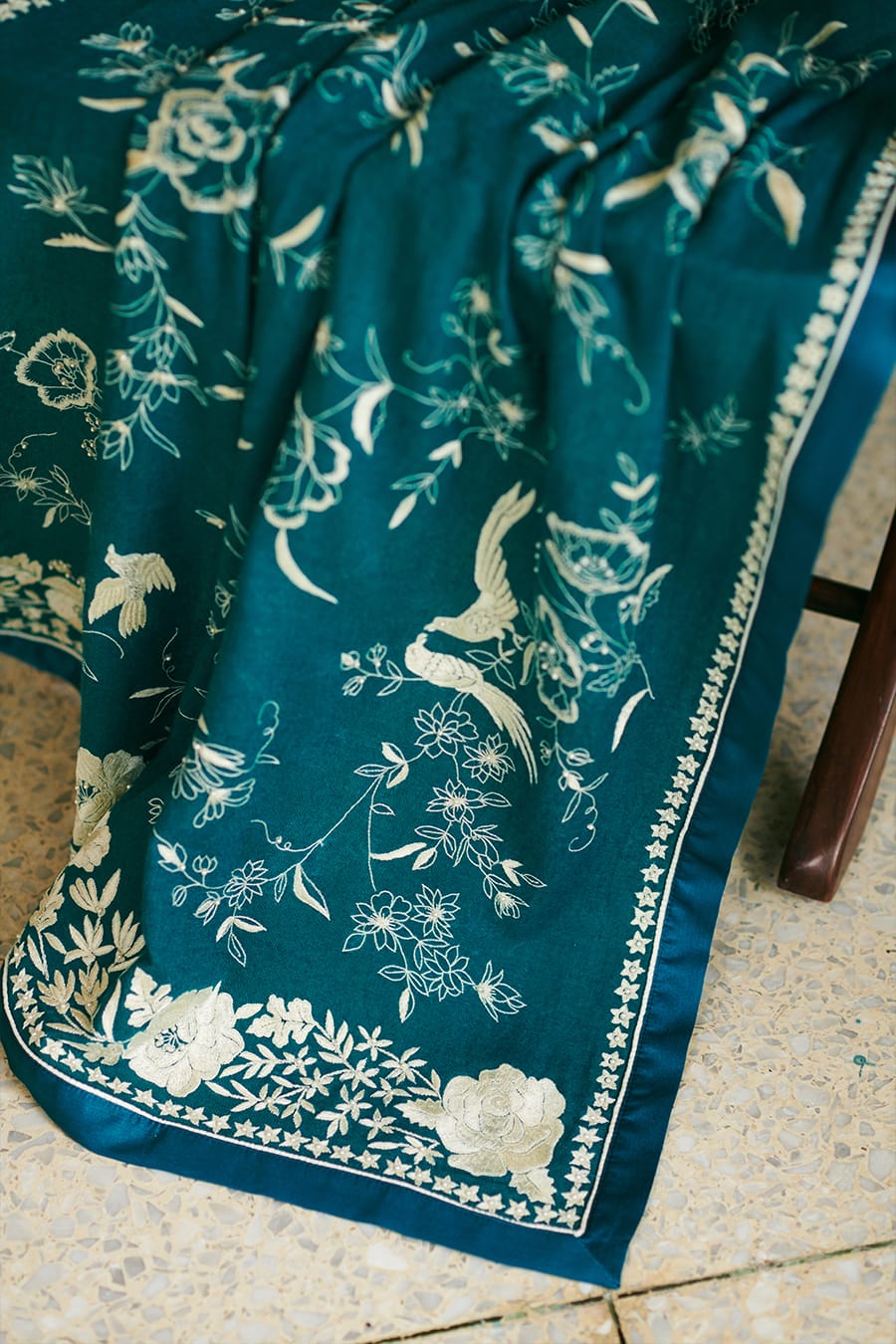 Named after the Persian garden of Paradise, our Chahar Bagh shawl features a lush rendition of flowers and birds on teal pashmina. This one is a classic you’ll treasure for the years to come.