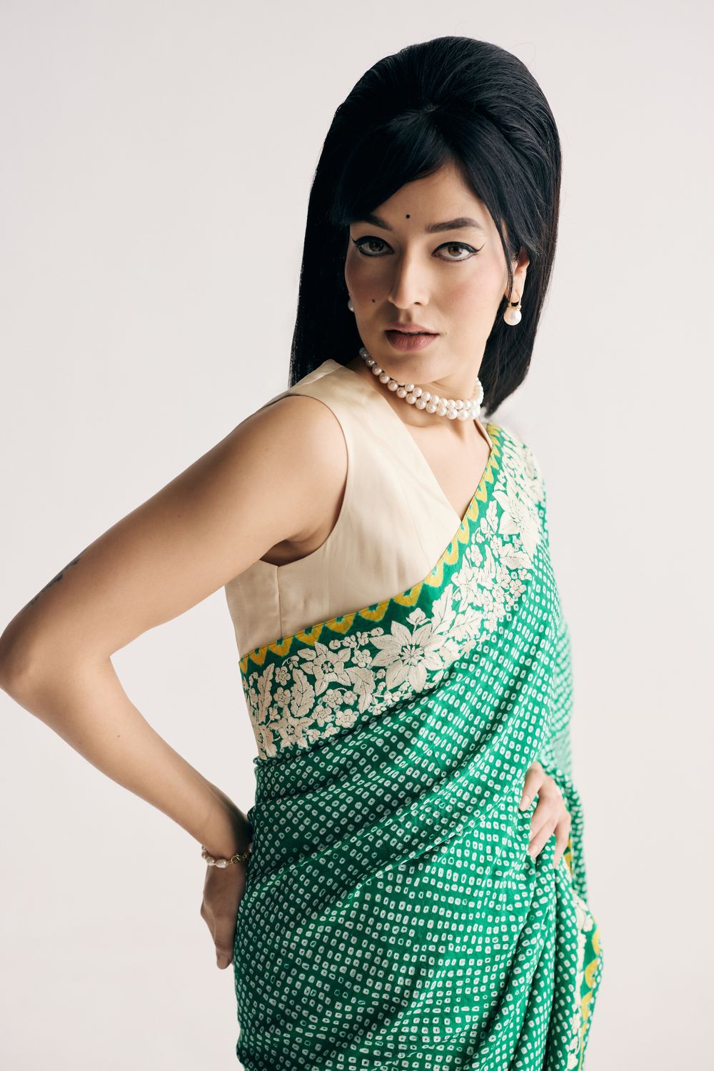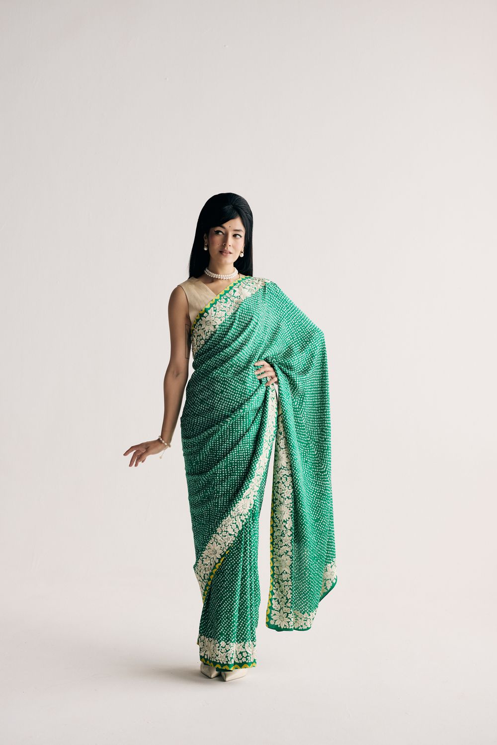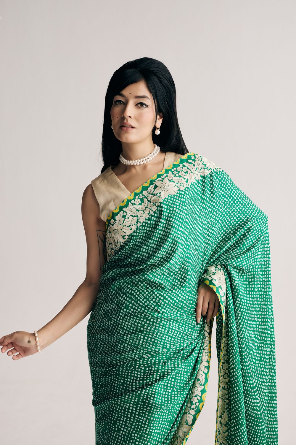Our Nutan sari in a vibrant panna green features bandhani dots dancing all over it framed by a hand-embroidered Parsi gara border with elegant damselfly motifs. The lightweight fabric makes it a dream to move in.