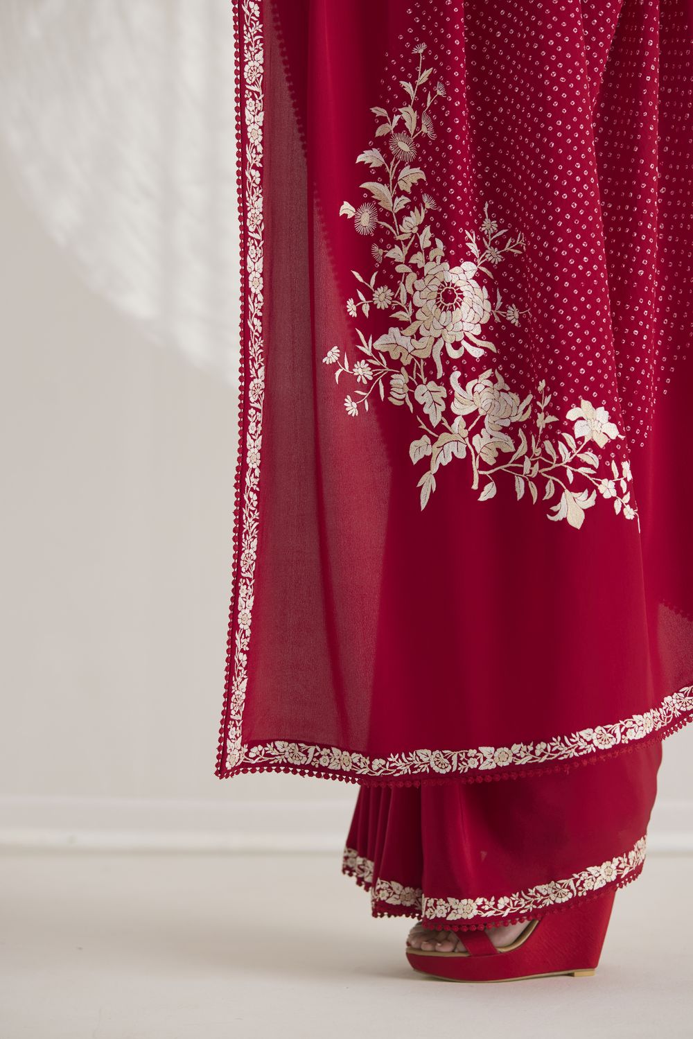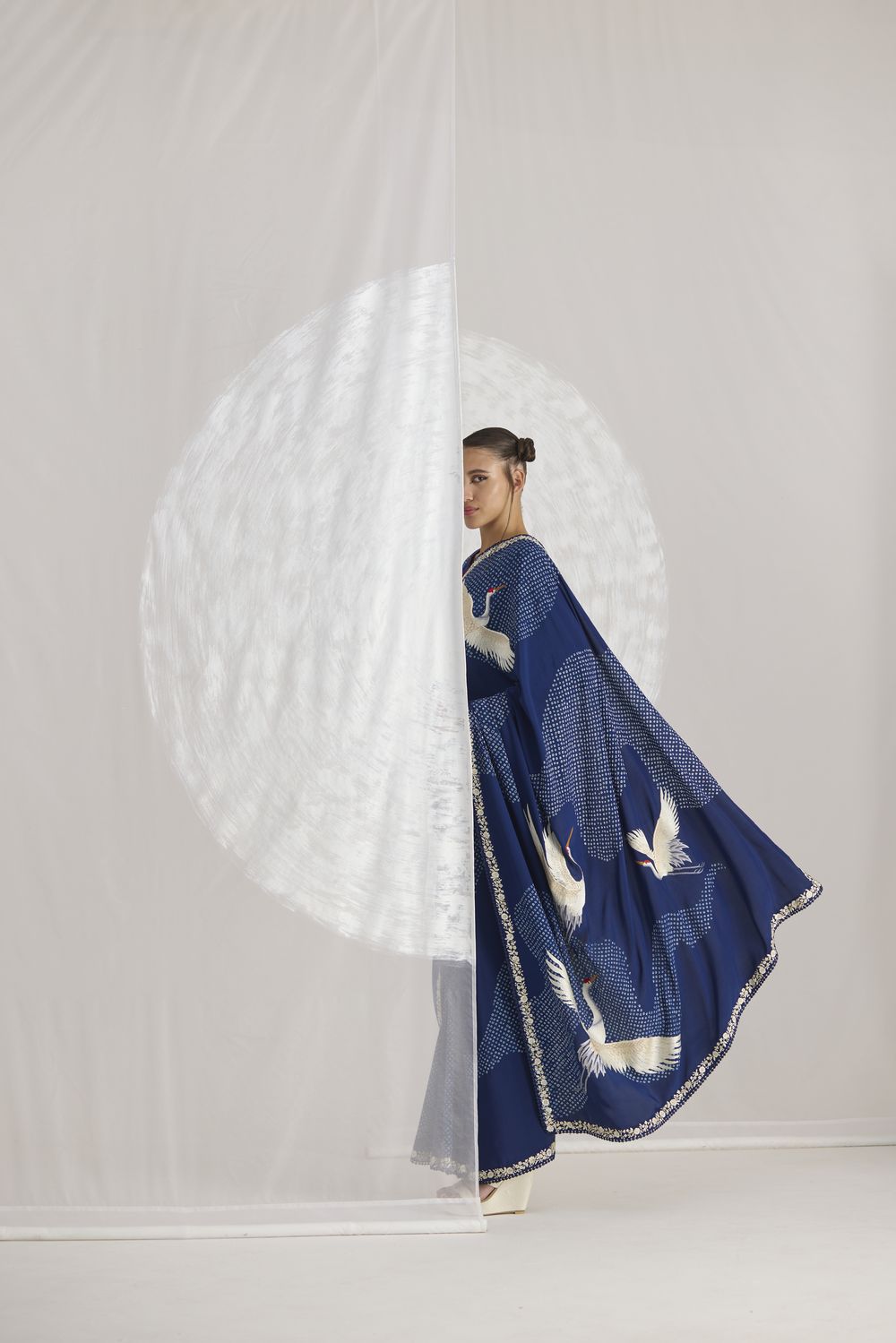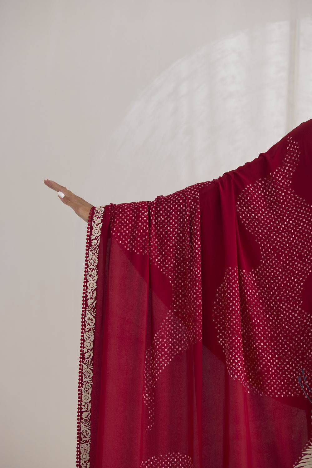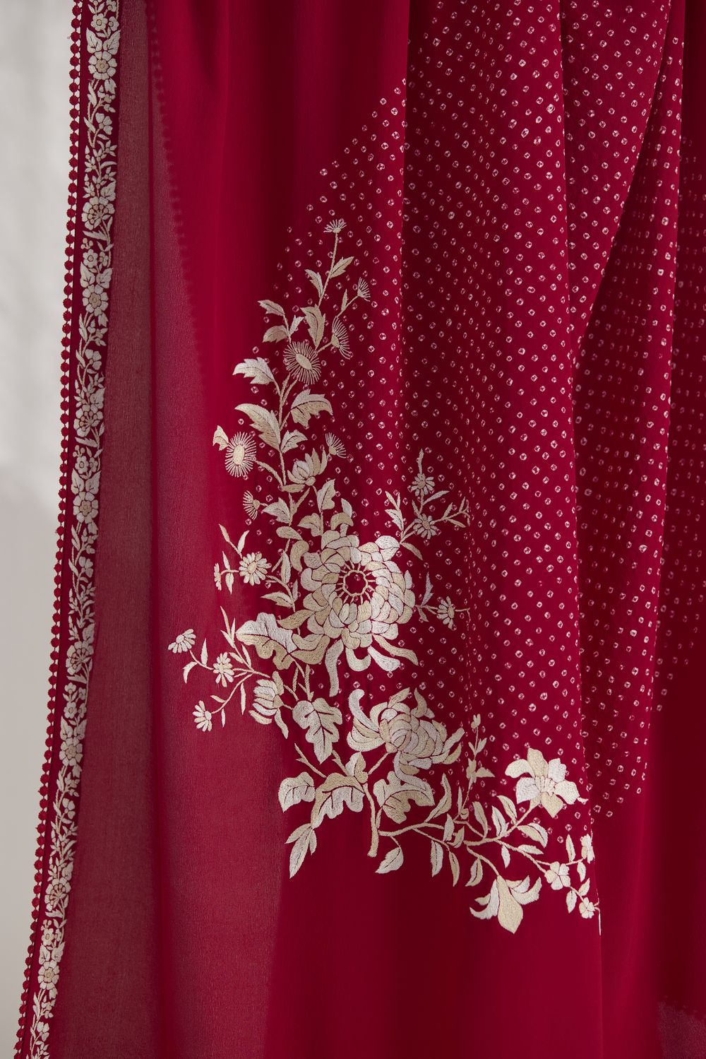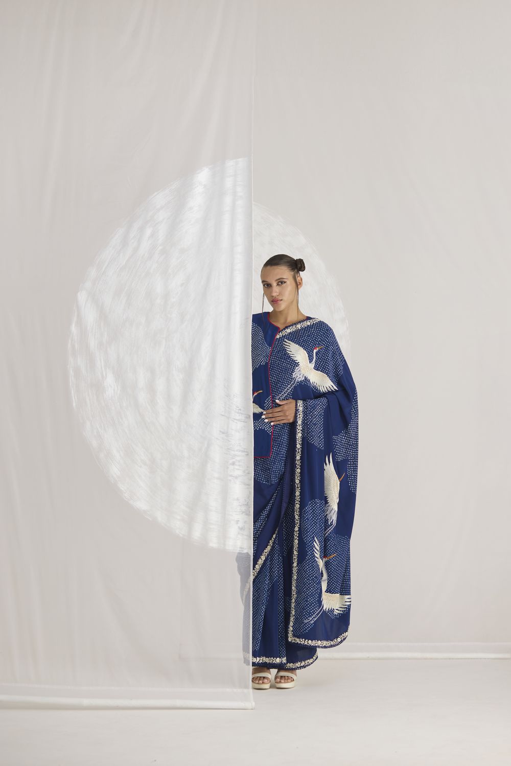 The ‘Ocean’ sari in striking vermillion features our signature hand-embroidered crane motifs against a smattering of bandhani dots rendered in a flowing organic pattern.