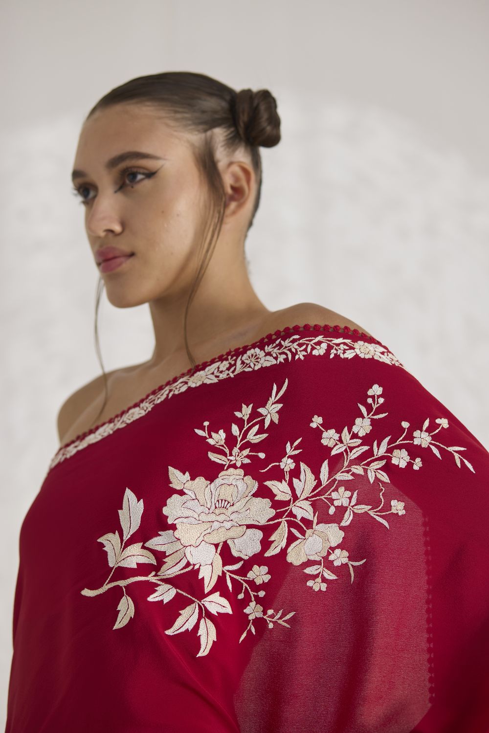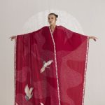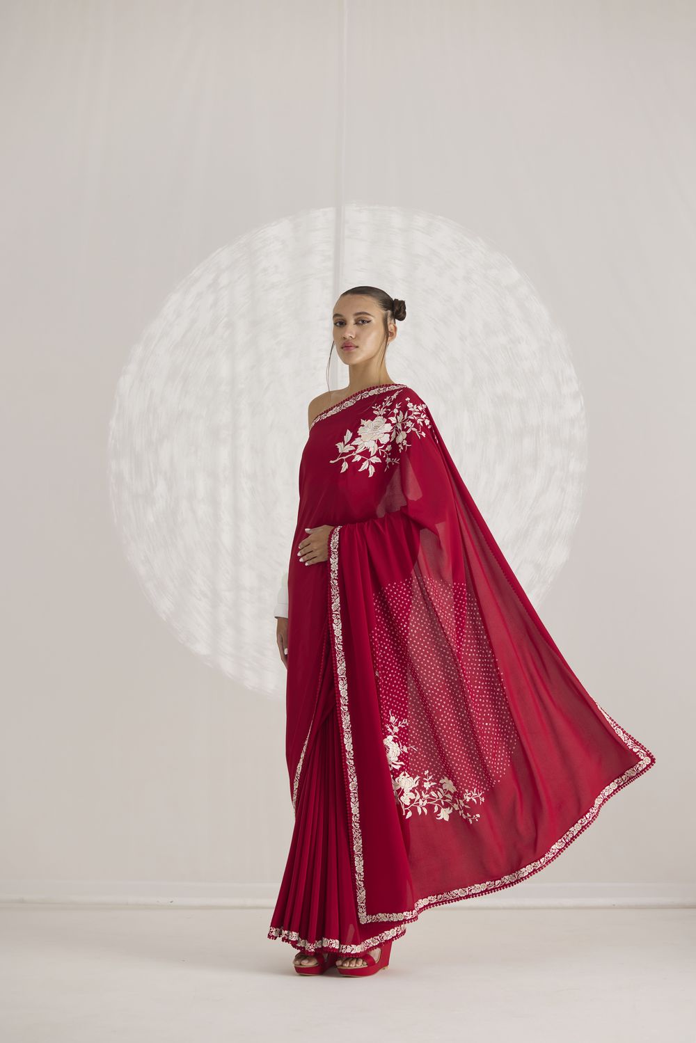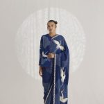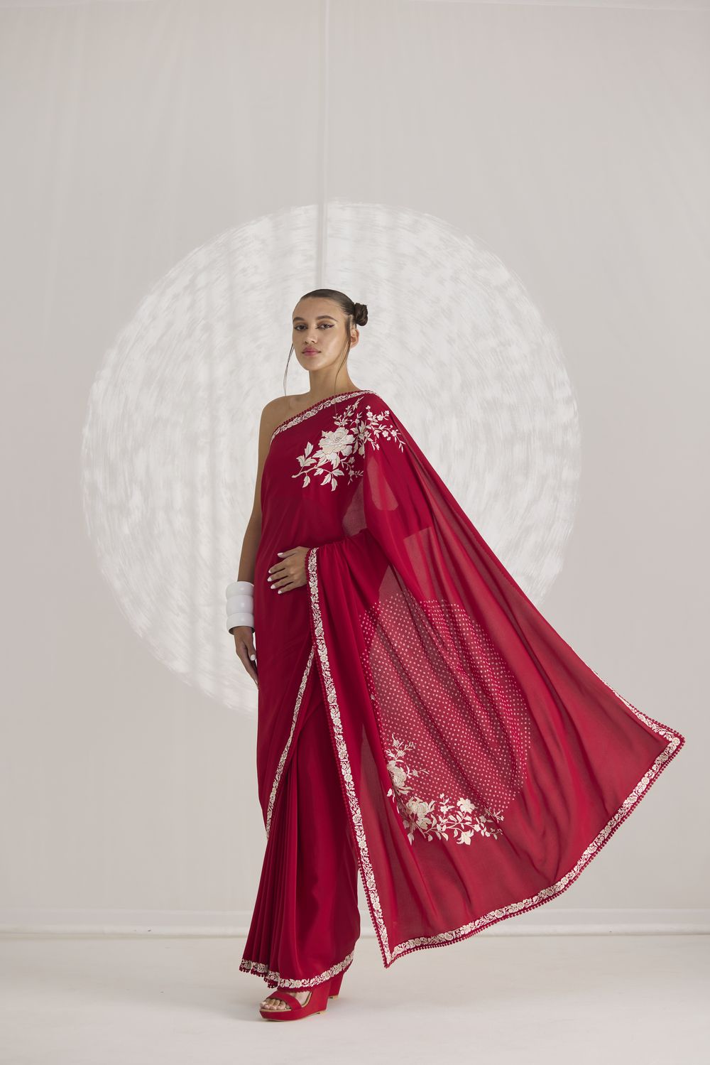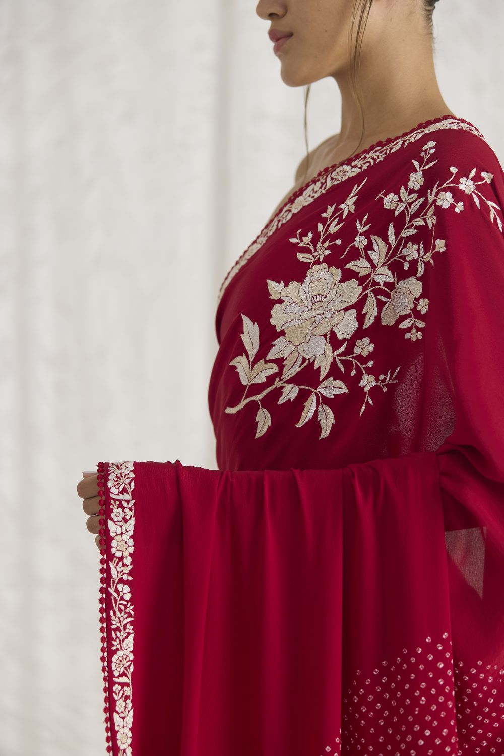 The ‘Ocean’ sari in striking vermillion features our signature hand-embroidered crane motifs against a smattering of bandhani dots rendered in a flowing organic pattern.