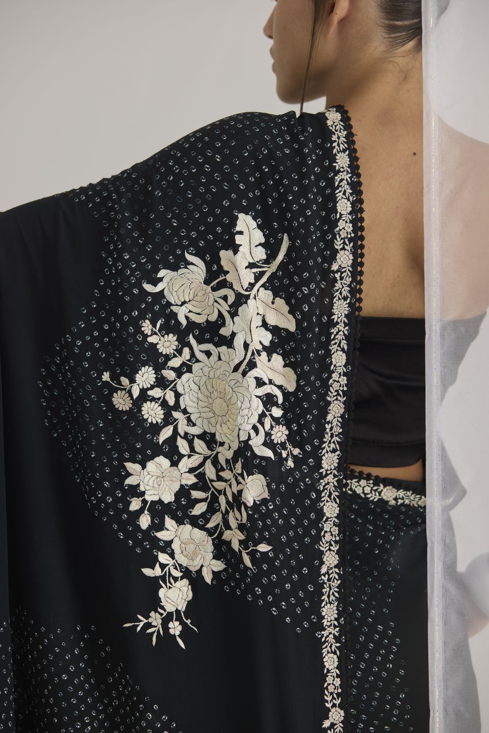 Fine Parsi needle craft juxtaposed with bandhani dots realised in a beautiful Viridian Green colour.