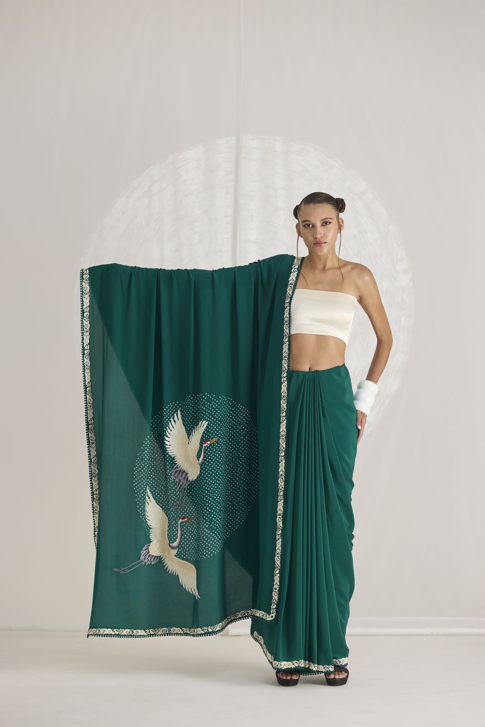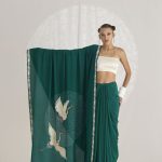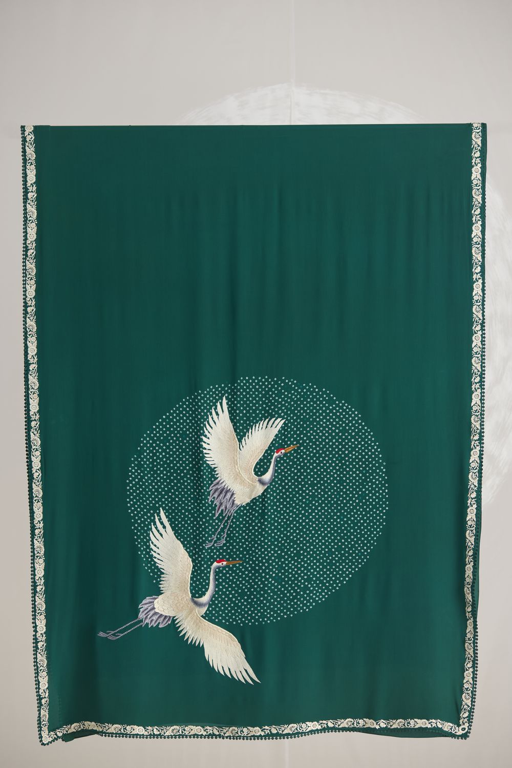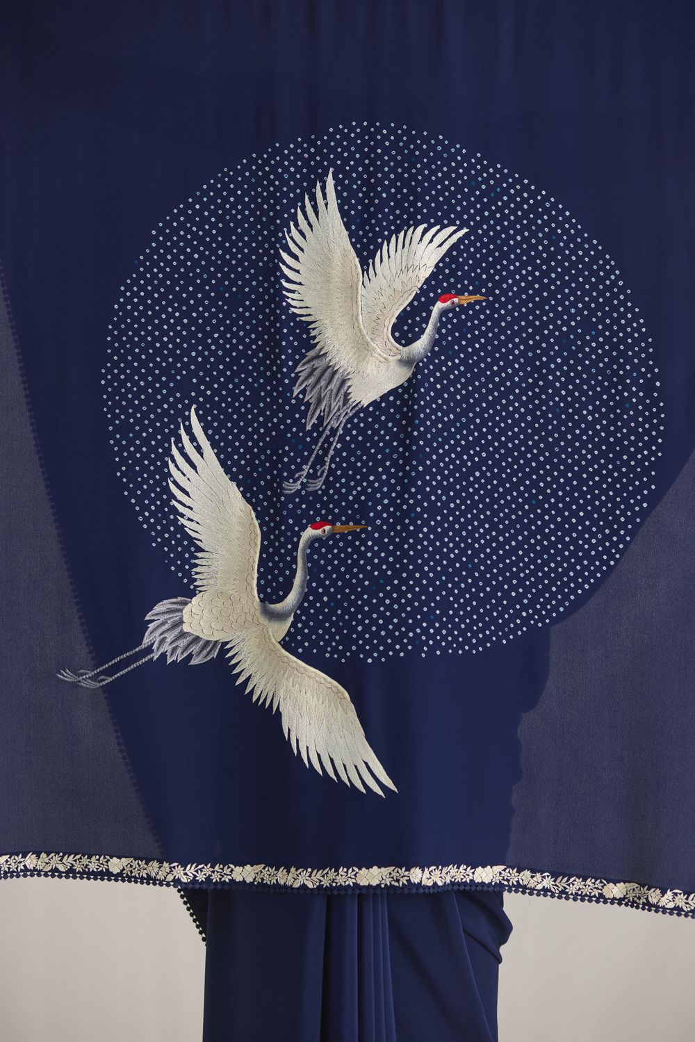 Our hand-embroidered cranes are majestically in flight over a ‘pond’ of handcrafted bandhani dots. Our ‘Crane Pond’ sari in an elegant navy shade is framed by a delicate Parsi Gara border.