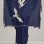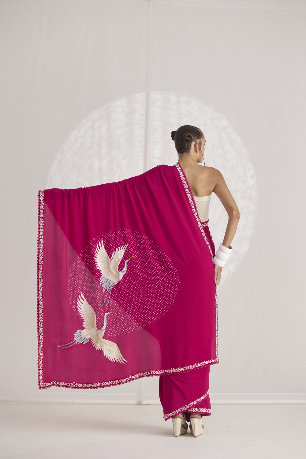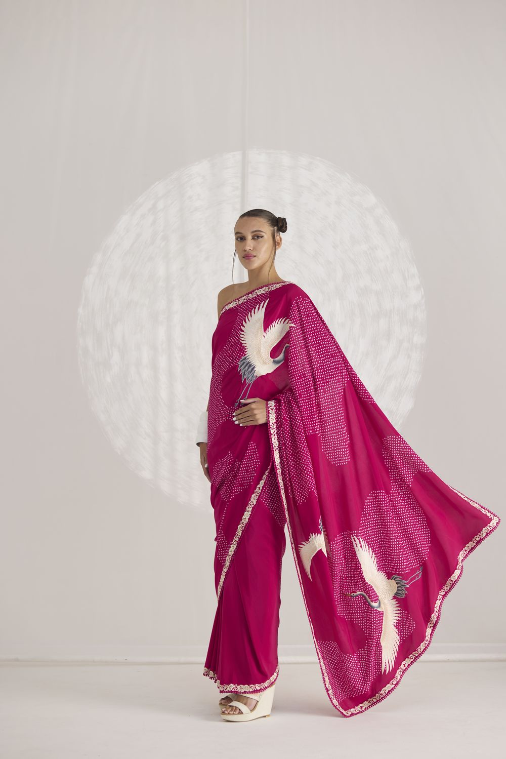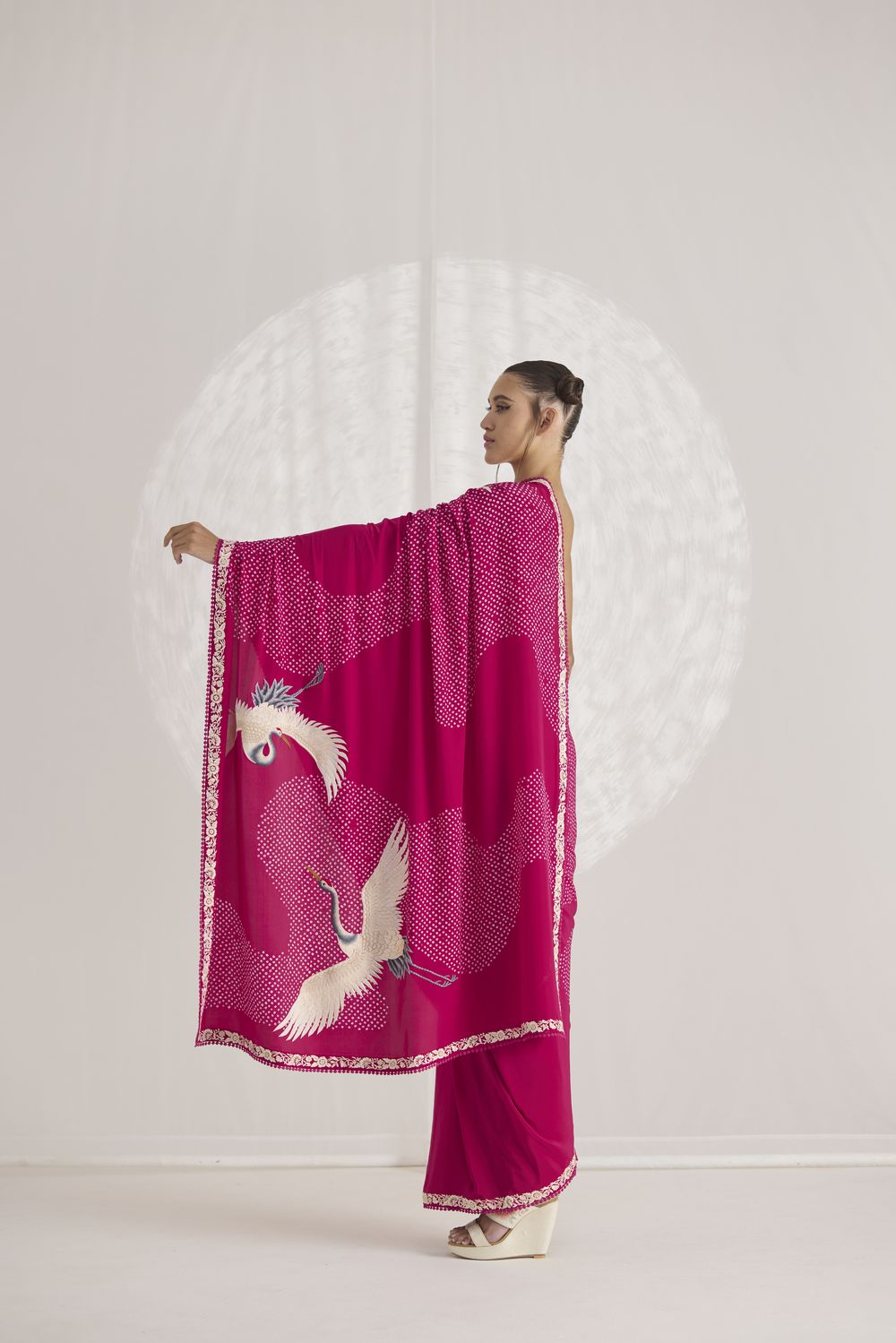 Our hand-embroidered cranes are majestically in flight over a ‘pond’ of handcrafted bandhani dots. Our ‘Crane Pond’ sari in an elegant navy shade is framed by a delicate Parsi Gara border.
