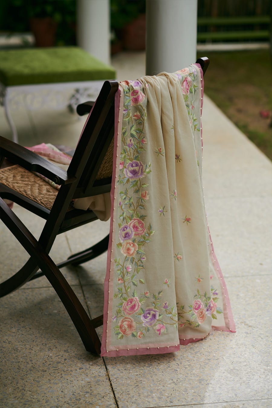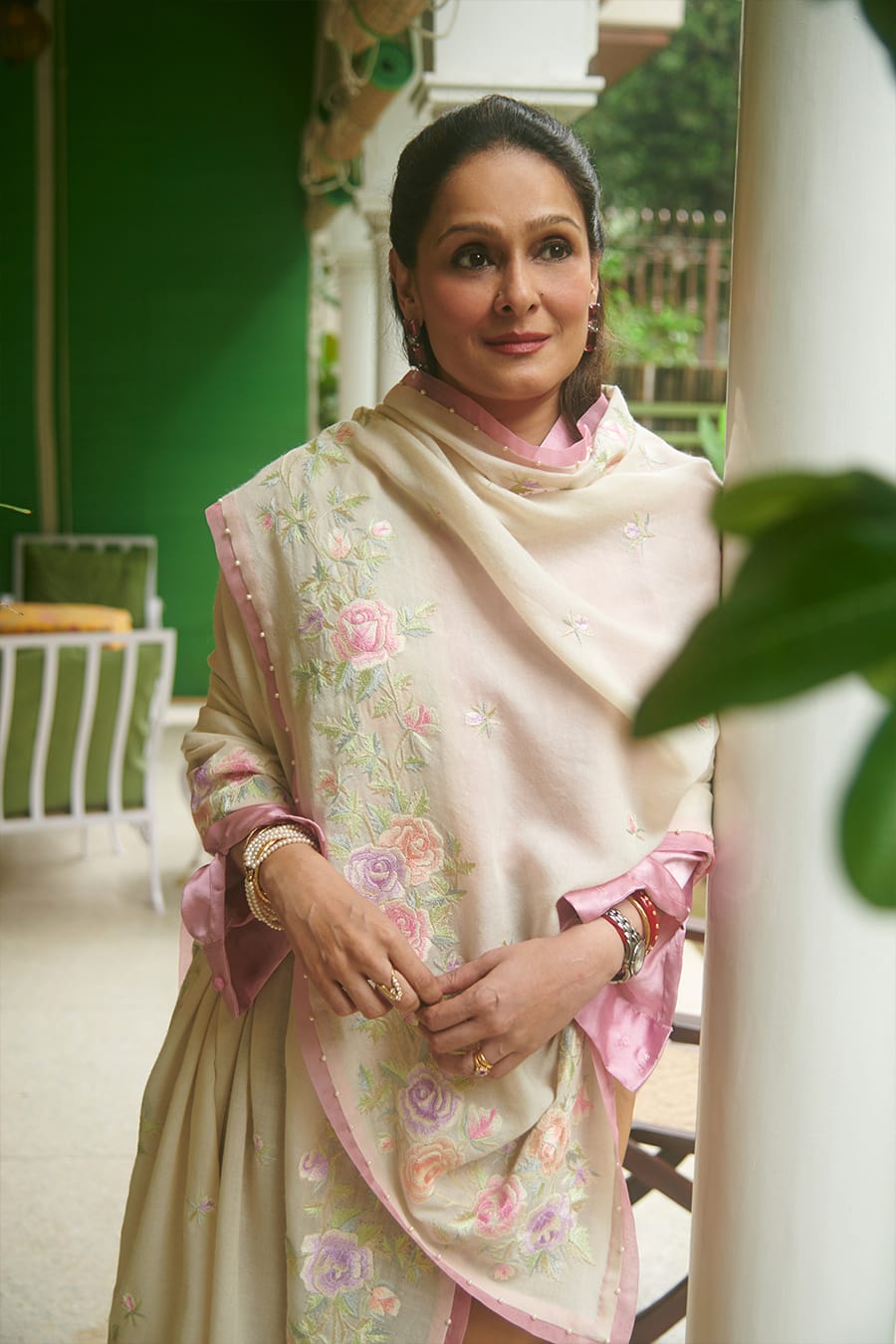Dr Amrita Bewoor-Sen @amritabewoor_sen stays warm in our Rose Trellis shawl in champagne with pastel roses hand-embroidered and encrusted with pearls. This soft pashmina shawl with a satin border also makes such a lovely present.