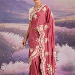 The Scallop Jewel french knot sari from our ‘Peking Garden’ capsule is hand-embroidered in ivory to bring alive the delicate richness of Chantilly lace. The Wine Berry crepe jacquard backdrop lends it yet another dimension, making this sari a modern heirloom, perfect for our times.