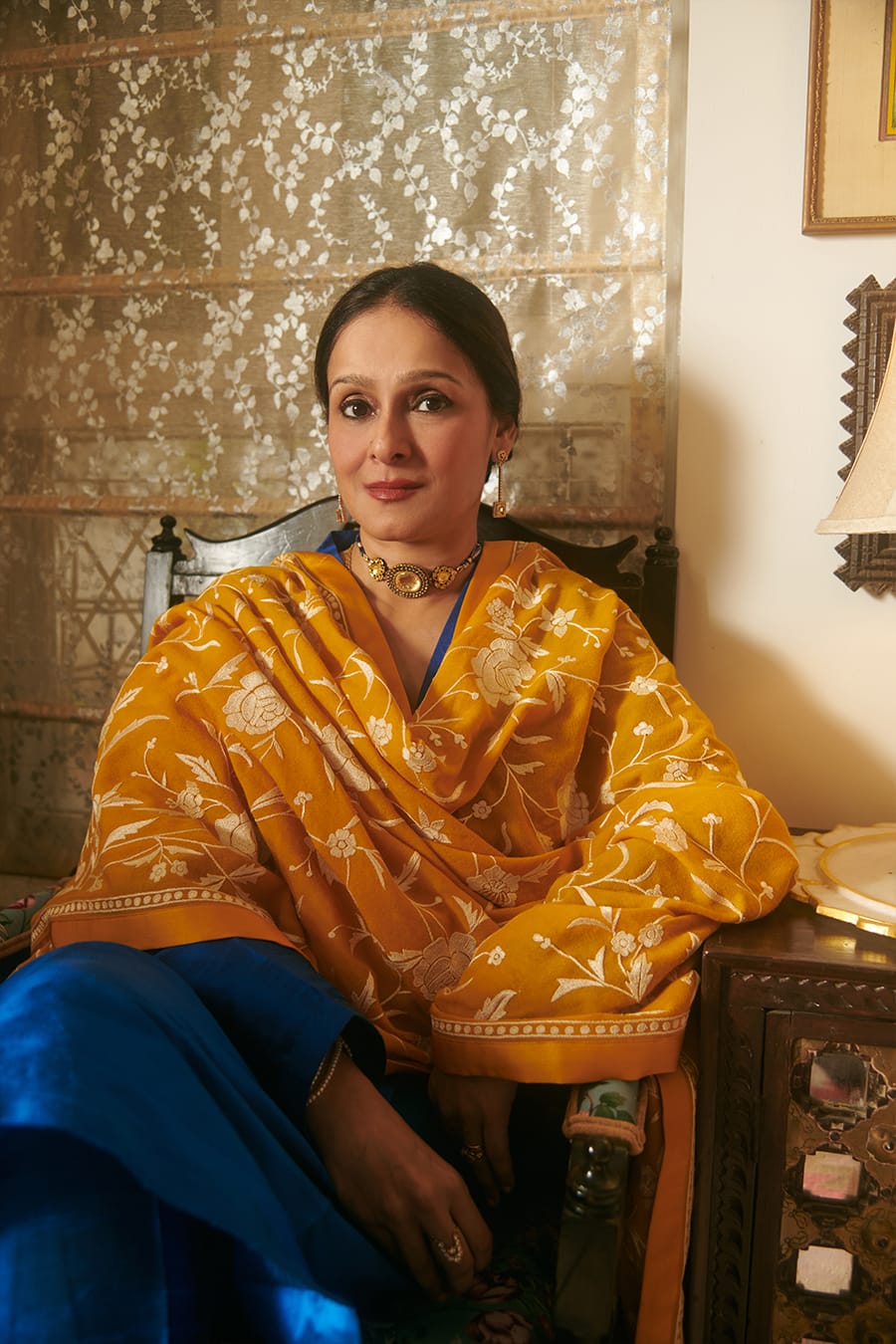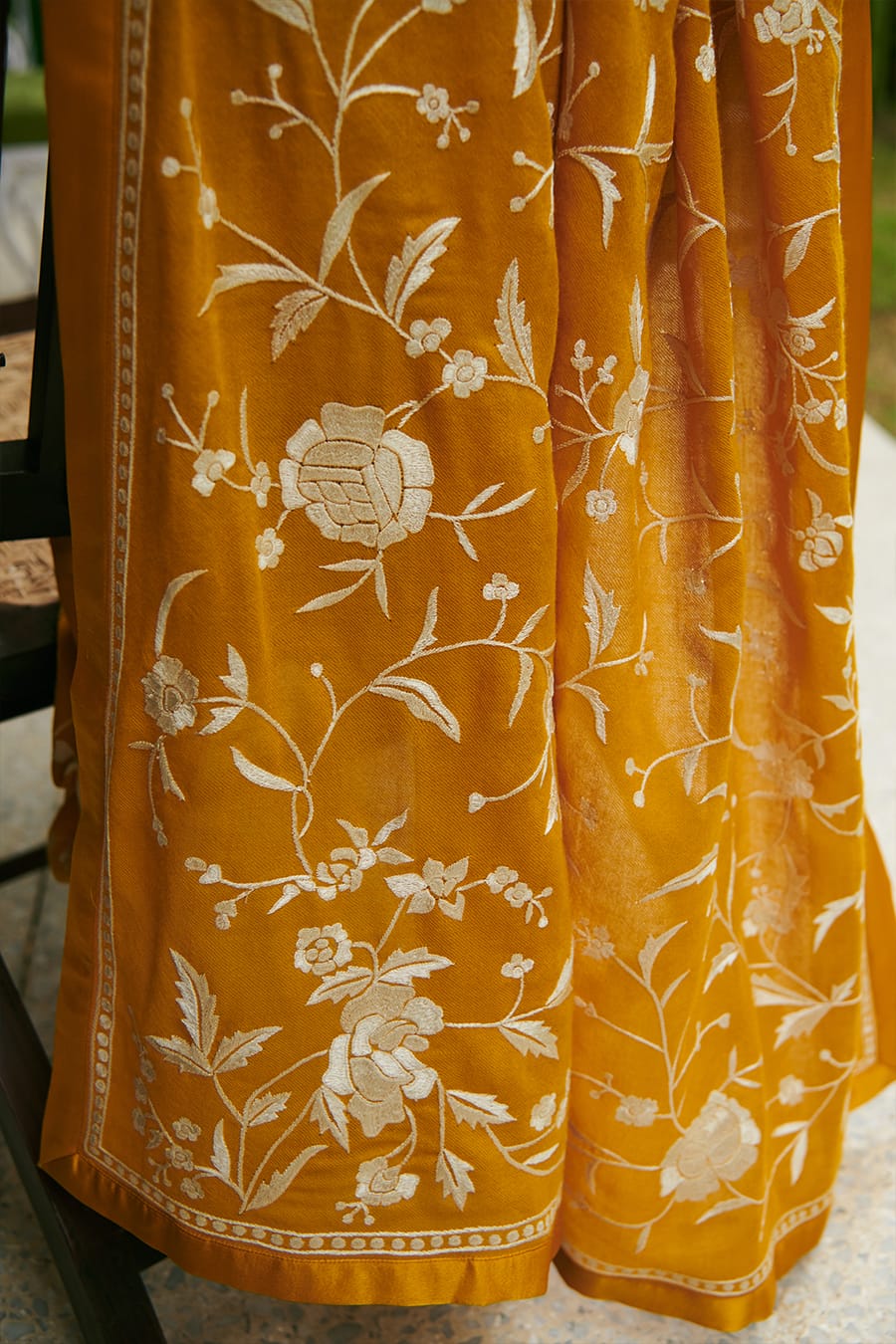 No feeling better than the winter sun. The elegant Dr. Amrita Bewoor Sen @amritabewoor_sen seen with her own spot of sunshine – our hand embroidered Shernaz Rose pashmina shawl. A lyrical symphony of intertwining roses & vines. Designed to age well, like you.