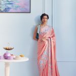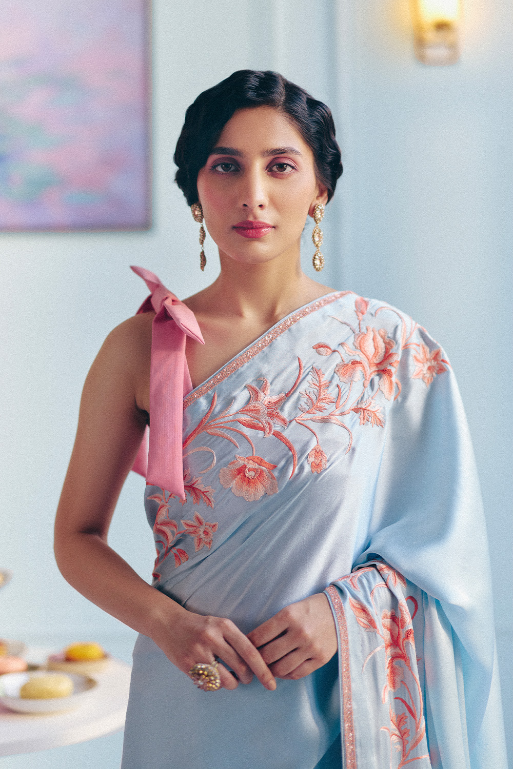 Made from lustrous satin, our ‘Shirley’ sari in Winter Blue features a luxurious hand-embroidered floral border in shades of Blush. We recognise that it’s important to look the part.
