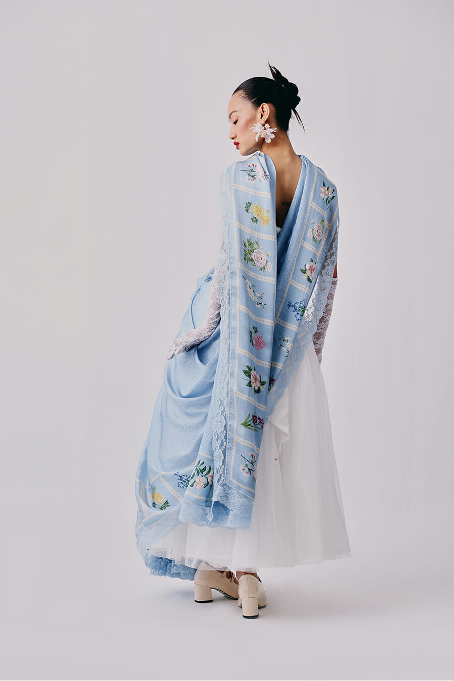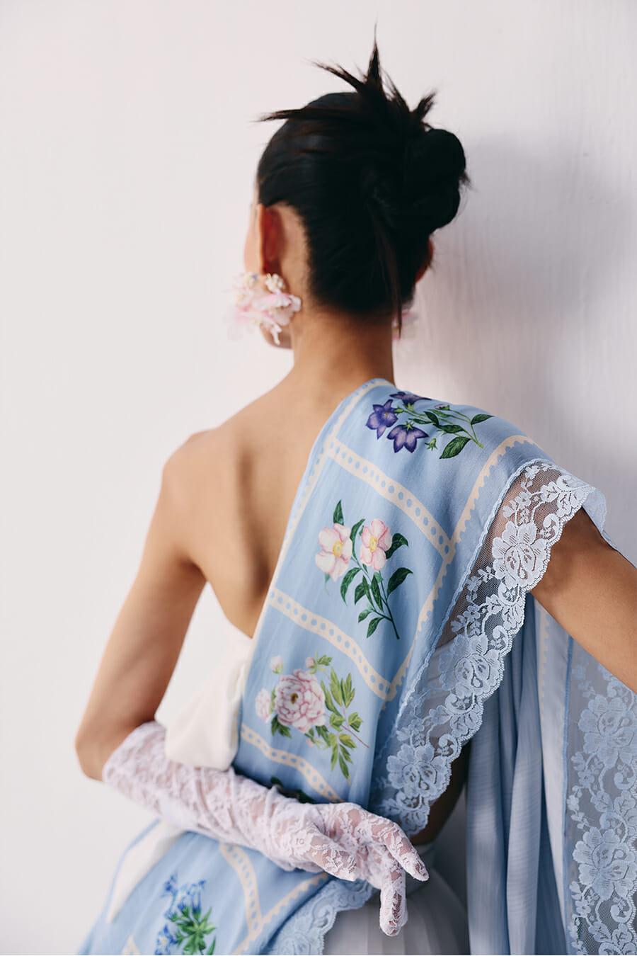The sari (the Blue Moon colour way pictured here) is handcrafted in lightweight crepe and features a border inspired by hand-painted stamps.