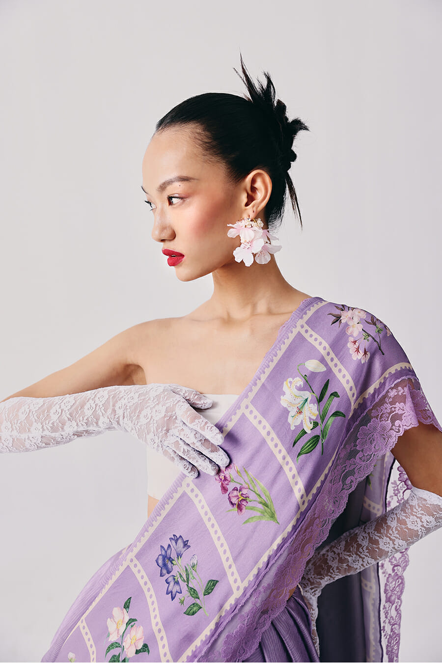 The lace-edging furthers the vintage charm of this sari which is such a fresh addition to any summer wardrobe.