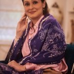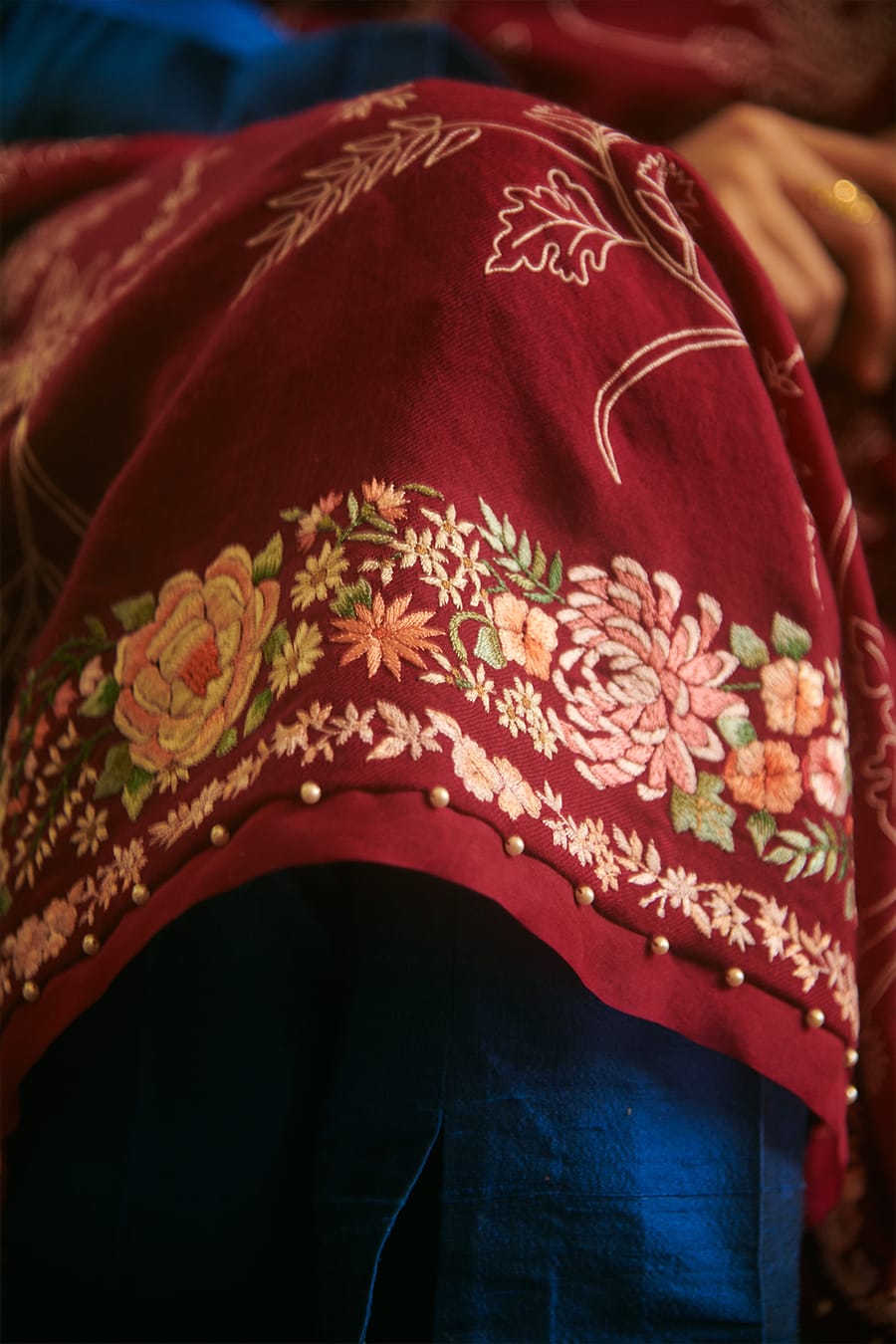 Dr Amrita Bewoor Sen @amritabewoor_sen just knows how to stay warm in style. Here she is wrapped up in our Tokyo pashmina shawl with trompe l’oeil embroidery in ivory, offset by colourful floral ends.