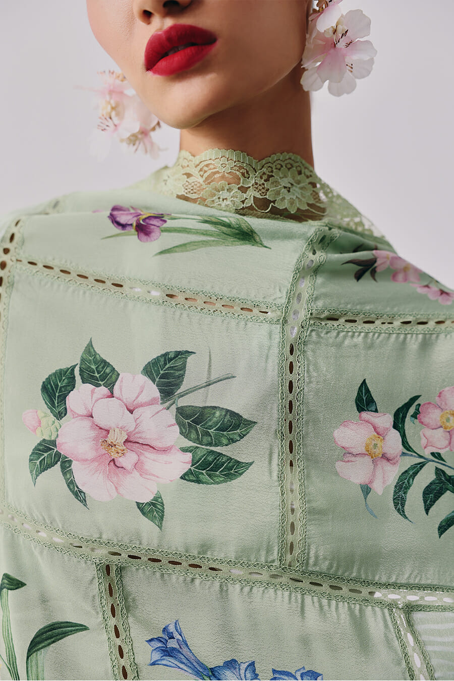 The sari (Pistachio version pictured here) handcrafted in lightweight crepe features a patchwork of florals and lace.