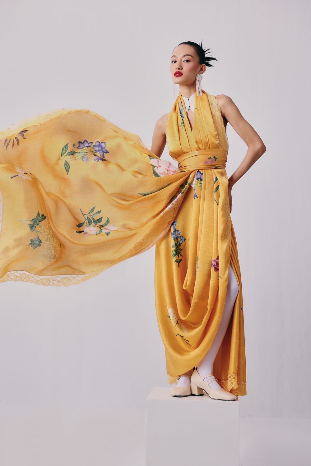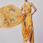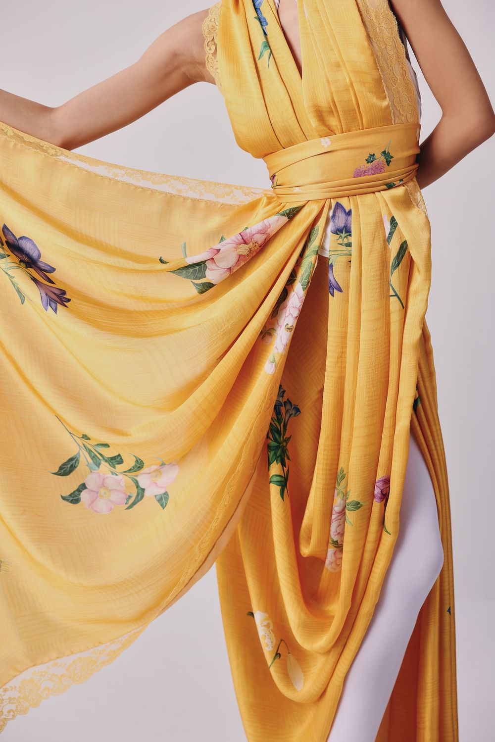 The sari handcrafted in lightweight satin, comes in two delicious colour ways — Mango Sorbet (pictured here) 💛 & Blue Moon.